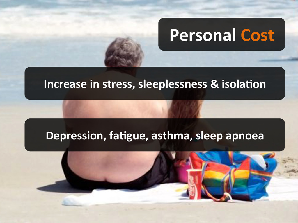 Personal)Cost) Increase)in)stress,)sleeplessness)&)isolaBon) Depression,)faBgue,)asthma,)sleep)apnoea)