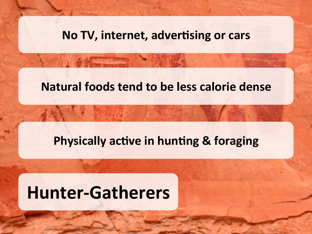 Hunter[Gatherers) Physically)acBve)in)hunBng)&)foraging) Natural)foods)tend)to)be)less)calorie)dense) No)TV,)internet,)adverBsing)or)cars)