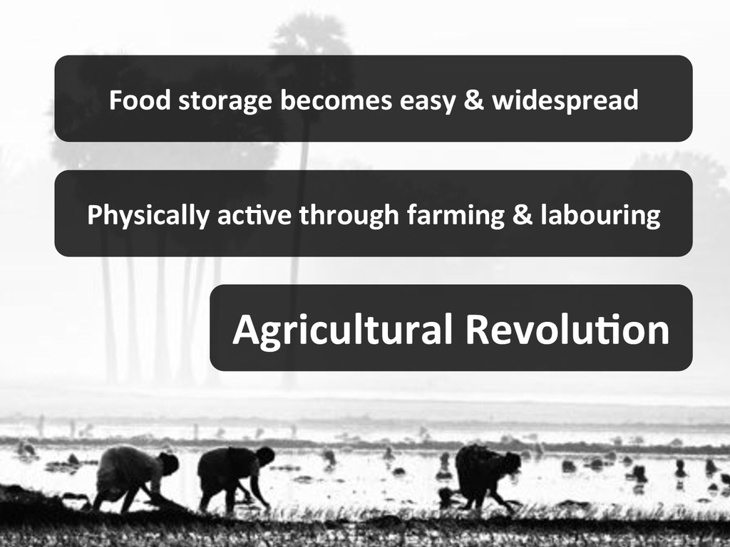 Agricultural)RevoluBon) Physically)acBve)through)farming)&)labouring) Food)storage)becomes)easy)&)widespread)