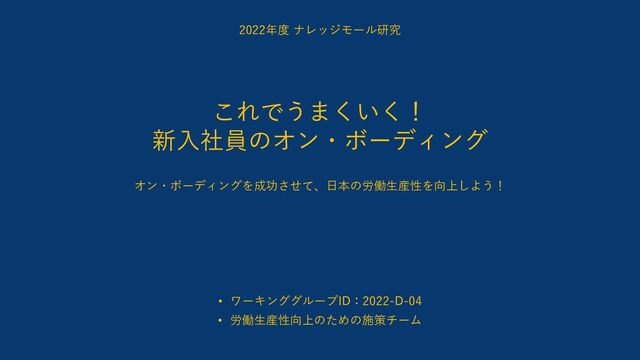 これでうまくいく! 新⼊社員のオン・ボーディング オン・ボーディングを成功させて、⽇本の労働⽣産性を向上しよう! 2022年度 ナレッジモール研究 • ワーキンググループID:2022-D-04 • 労働⽣産性向上のための施策チーム