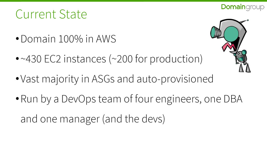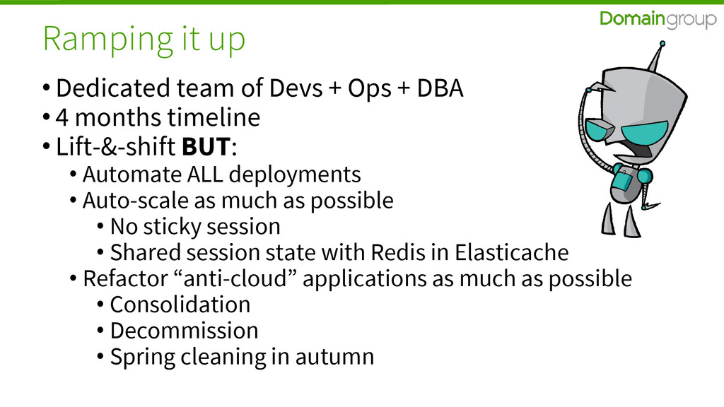 DBA •4 months timeline •Lift-&-shift BUT: • Automate ALL deployments • Auto-scale as much as possible • No sticky session • Shared session state with Redis in Elasticache • Refactor “anti-cloud” applications as much as possible • Consolidation • Decommission • Spring cleaning in autumn