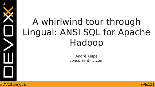 @fs111 #DV13 #lingual Lingual – ANSI SQL on Cascading http://www.cascading.org/lingual/