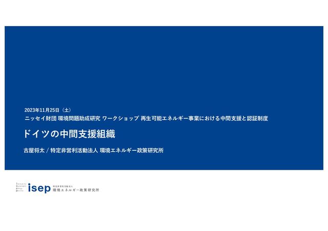 ドイツの中間⽀援組織 古屋将太 / 特定⾮営利活動法⼈ 環境エネルギー政策研究所 2023年11⽉25⽇(⼟) ニッセイ財団 環境問題助成研究 ワークショップ 再⽣可能エネルギー事業における中間⽀援と認証制度
