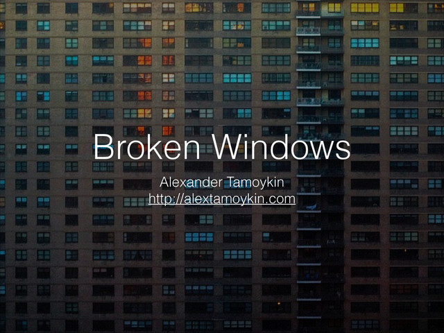 This presentation shows how Broken Windows theory can be applied to Software Engineering. It shows how to deal with broken windows in our software, deliver value and keep programmers happy.