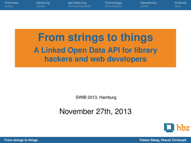 of hbz, since 2010 title data of union catalog (lobid-resources), authority data (lobid-organisations) Dumps, resolvable URIs, content negotiation, RDFa, SPARQL (triple store) different problems, new requirements → developed a new backend since late 2012 From strings to things Fabian Steeg, Pascal Christoph
