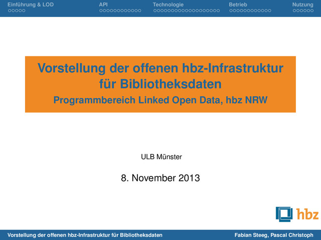 hbz-Infrastruktur für Bibliotheksdaten Programmbereich Linked Open Data, hbz NRW Fabian Steeg, Pascal Christoph ULB Münster 8. November 2013 Vorstellung der offenen hbz-Infrastruktur für Bibliotheksdaten Fabian Steeg, Pascal Christoph