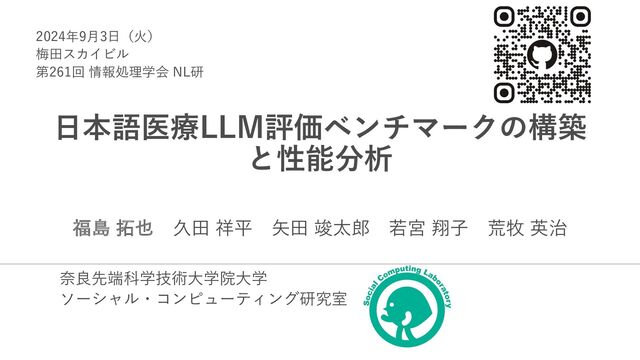 l 軽量LLM(10B以下程度)でも解ける可能性 (個⼈情報を含む⽂書を扱う際はこっちで解けると嬉しい) l 読影レポートから癌の進⾏度を予測(RRTNM) l 医療⽂書から疾患名や薬品情報の固有表現抽出(MRNER,NRNER) l 個⼈の発⾔から症状の有無を予測(SMDIS) まとめ 専⾨的な医学知識が 特に要求される? (知識寄り?) 与えられたテキスト情報と ⼀般知識でも解きやすい? (応⽤寄り?)