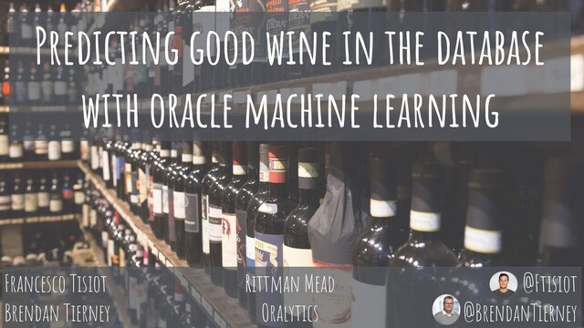 ''Wine_TRAIN_DATA', case_id_column_name => 'ID', target_column_name => 'POINTS_BIN', settings_table_name => 'Wine_build_settings'); END; / CREATE ML MODEL BEGIN DBMS_DATA_MINING.CREATE_MODEL( model_name => 'Wine_CLASS_MODEL', mining_function => dbms_data_mining.classification, data_table_name => ''Wine_TRAIN_DATA', case_id_column_name => 'ID', target_column_name => 'POINTS_BIN', settings_table_name => 'Wine_build_settings'); END; / BEGIN DBMS_DATA_MINING.CREATE_MODEL( model_name => 'Wine_CLASS_MODEL', mining_function => dbms_data_mining.classification, data_table_name => ''Wine_TRAIN_DATA', case_id_column_name => 'ID', target_column_name => 'POINTS_BIN', settings_table_name => 'Wine_build_settings'); END; / BEGIN DBMS_DATA_MINING.CREATE_MODEL( model_name => 'Wine_CLASS_MODEL', mining_function => dbms_data_mining.classification, data_table_name => ''Wine_TRAIN_DATA', case_id_column_name => 'ID', target_column_name => 'POINTS_BIN', settings_table_name => 'Wine_build_settings'); END; / BEGIN DBMS_DATA_MINING.CREATE_MODEL( model_name => 'Wine_CLASS_MODEL', mining_function => dbms_data_mining.classification, data_table_name => ''Wine_TRAIN_DATA', case_id_column_name => 'ID', target_column_name => 'POINTS_BIN', settings_table_name => 'Wine_build_settings'); END; / BEGIN DBMS_DATA_MINING.CREATE_MODEL( model_name => 'Wine_CLASS_MODEL', mining_function => dbms_data_mining.classification, data_table_name => ''Wine_TRAIN_DATA', case_id_column_name => 'ID', target_column_name => 'POINTS_BIN', settings_table_name => 'Wine_build_settings'); END; / BEGIN DBMS_DATA_MINING.CREATE_MODEL( model_name => 'Wine_CLASS_MODEL', mining_function => dbms_data_mining.classification, data_table_name => ''Wine_TRAIN_DATA', case_id_column_name => 'ID', target_column_name => 'POINTS_BIN', settings_table_name => 'Wine_build_settings'); END; / @Ftisiot @BrendanTierney