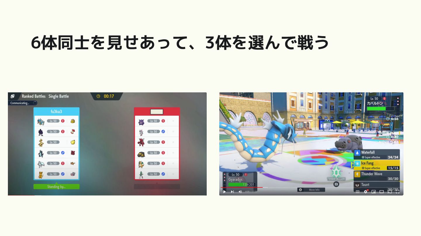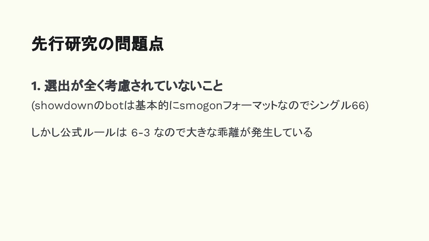先行研究の問題点 1. 選出が全く考慮されていないこと (showdownのbotは基本的にsmogonフォーマットなのでシングル66) しかし公式ルールは 6-3 なので大きな乖離が発生している