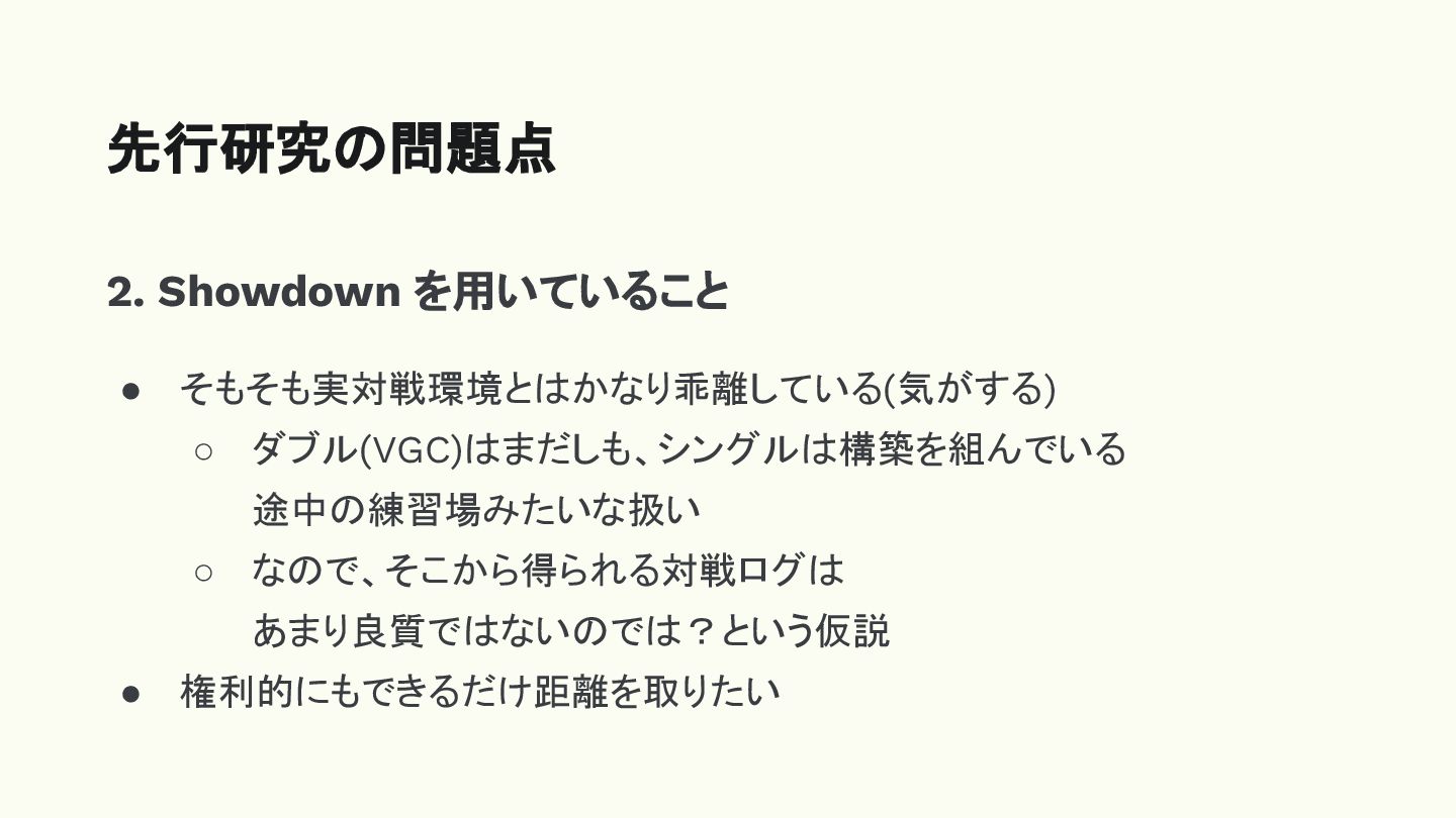 2. Showdown を用いていること • そもそも実対戦環境とはかなり乖離している(気がする) ◦ ダブル(VGC)はまだしも、シングルは構築を組んでいる 途中の練習場みたいな扱い ◦ なので、そこから得られる対戦ログは