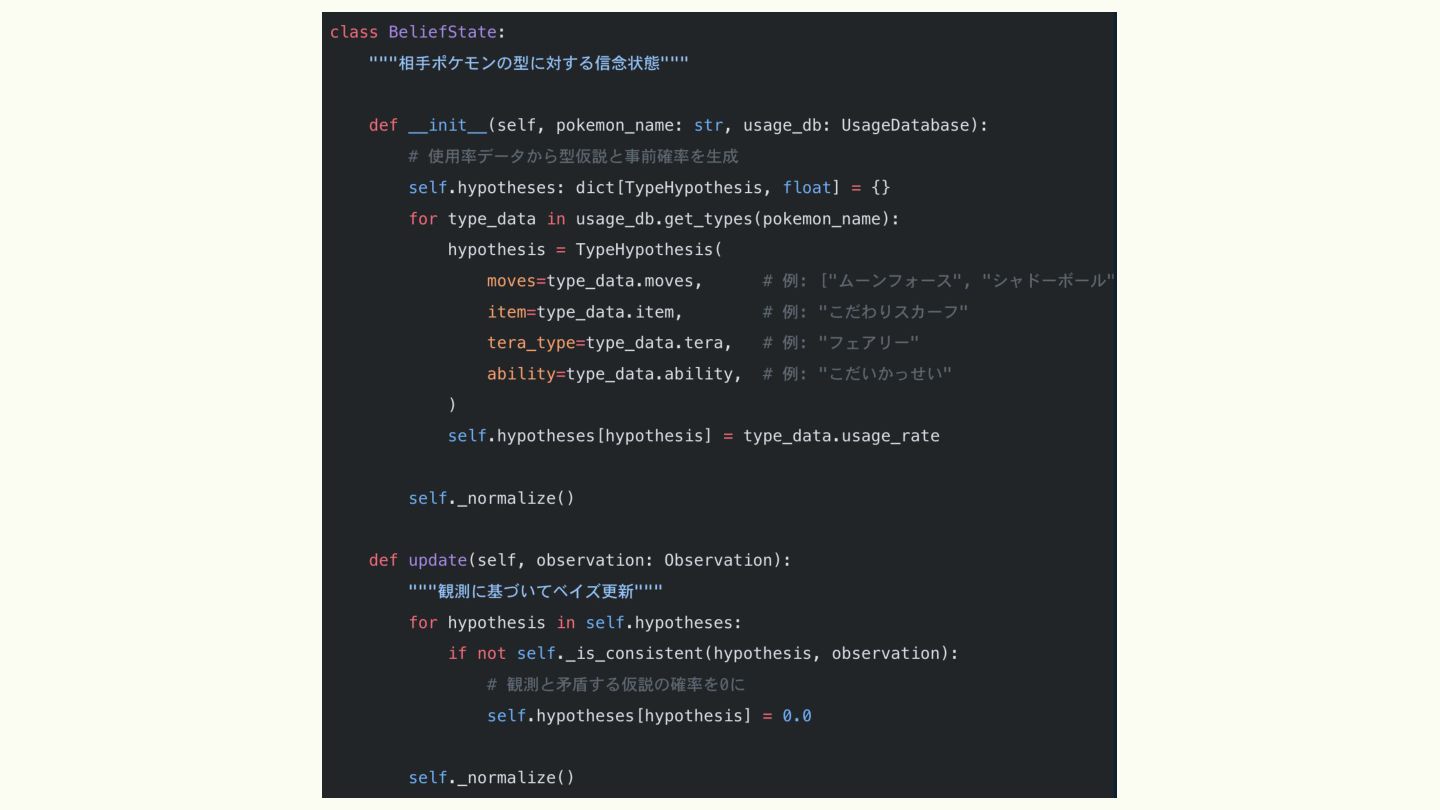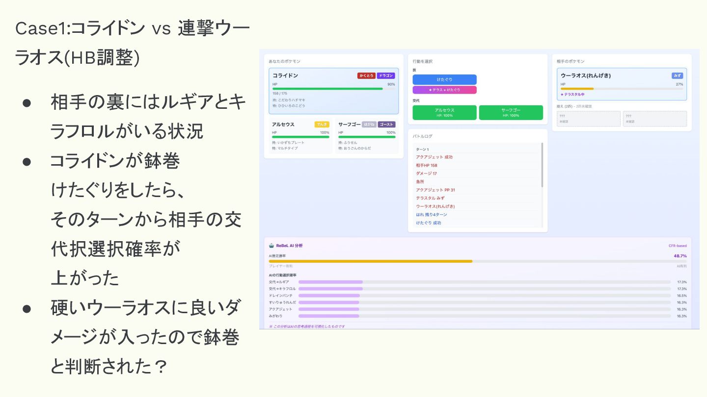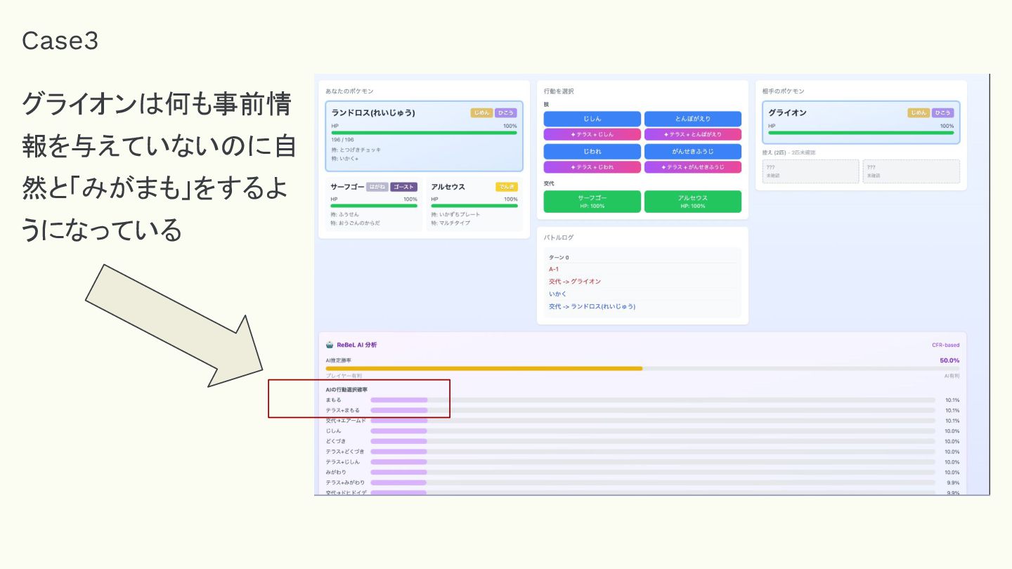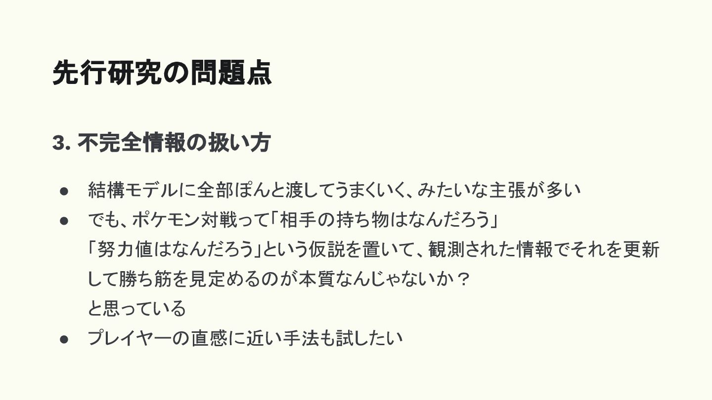 3. 不完全情報の扱い方 • 結構モデルに全部ぽんと渡してうまくいく、みたいな主張が多い • でも、ポケモン対戦って「相手の持ち物はなんだろう」 「努力値はなんだろう」という仮説を置いて、観測された情報でそれを更新 して勝ち筋を見定めるのが本質なんじゃないか? と思っている •