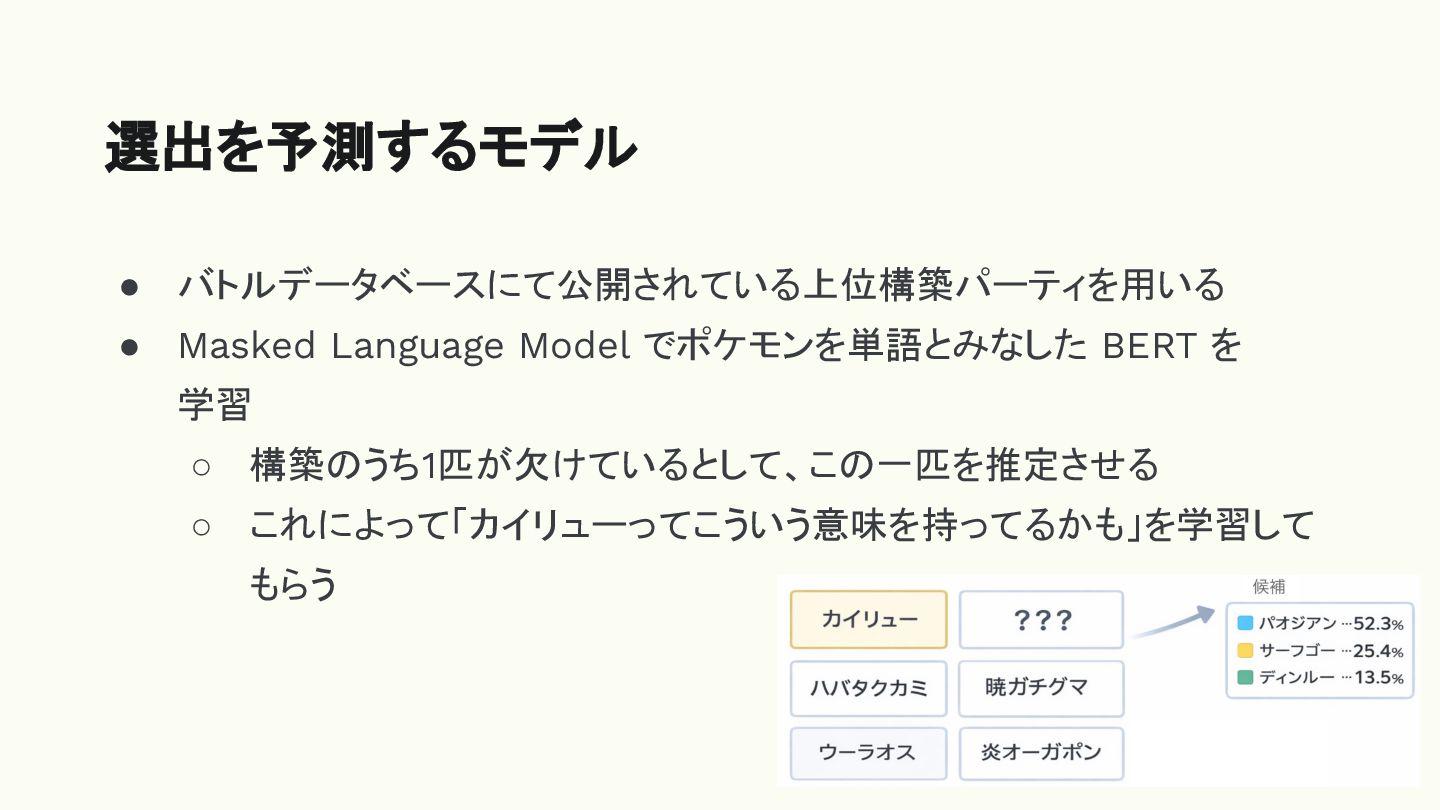 選出を予測するモデル • バトルデータベースにて公開されている上位構築パーティを用いる • Masked Language Model でポケモンを単語とみなした BERT を