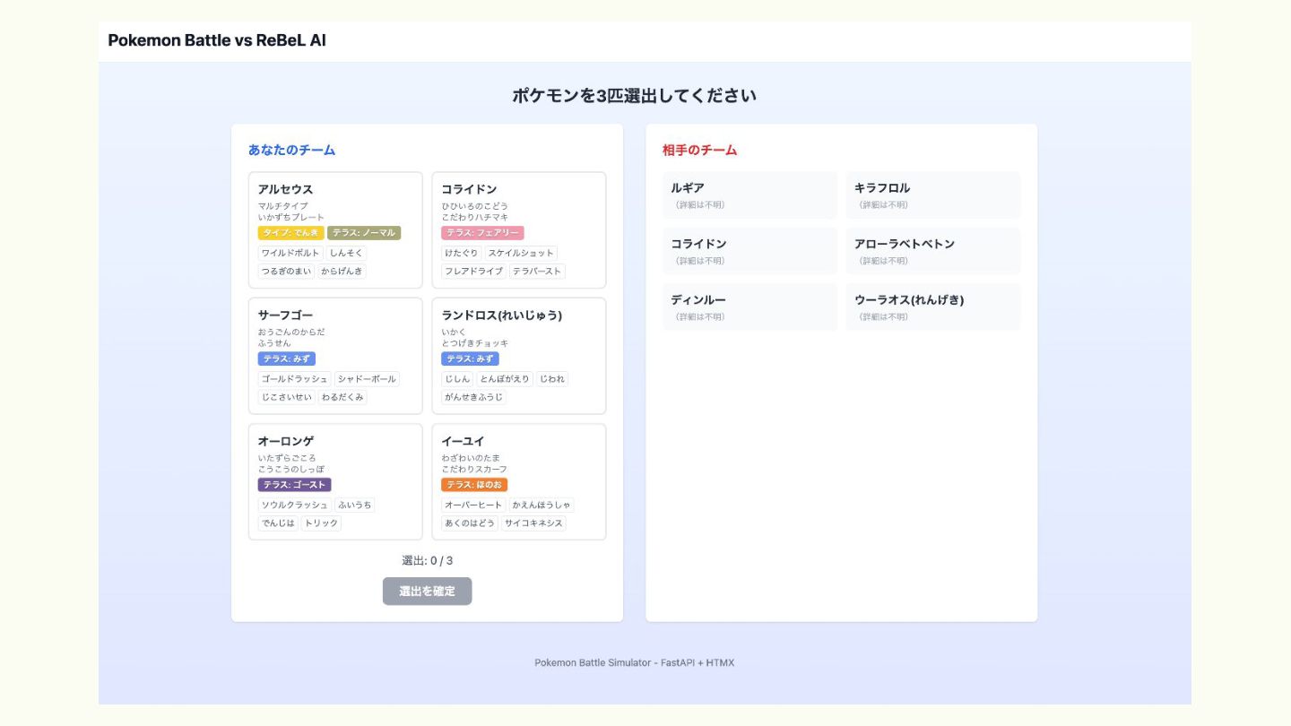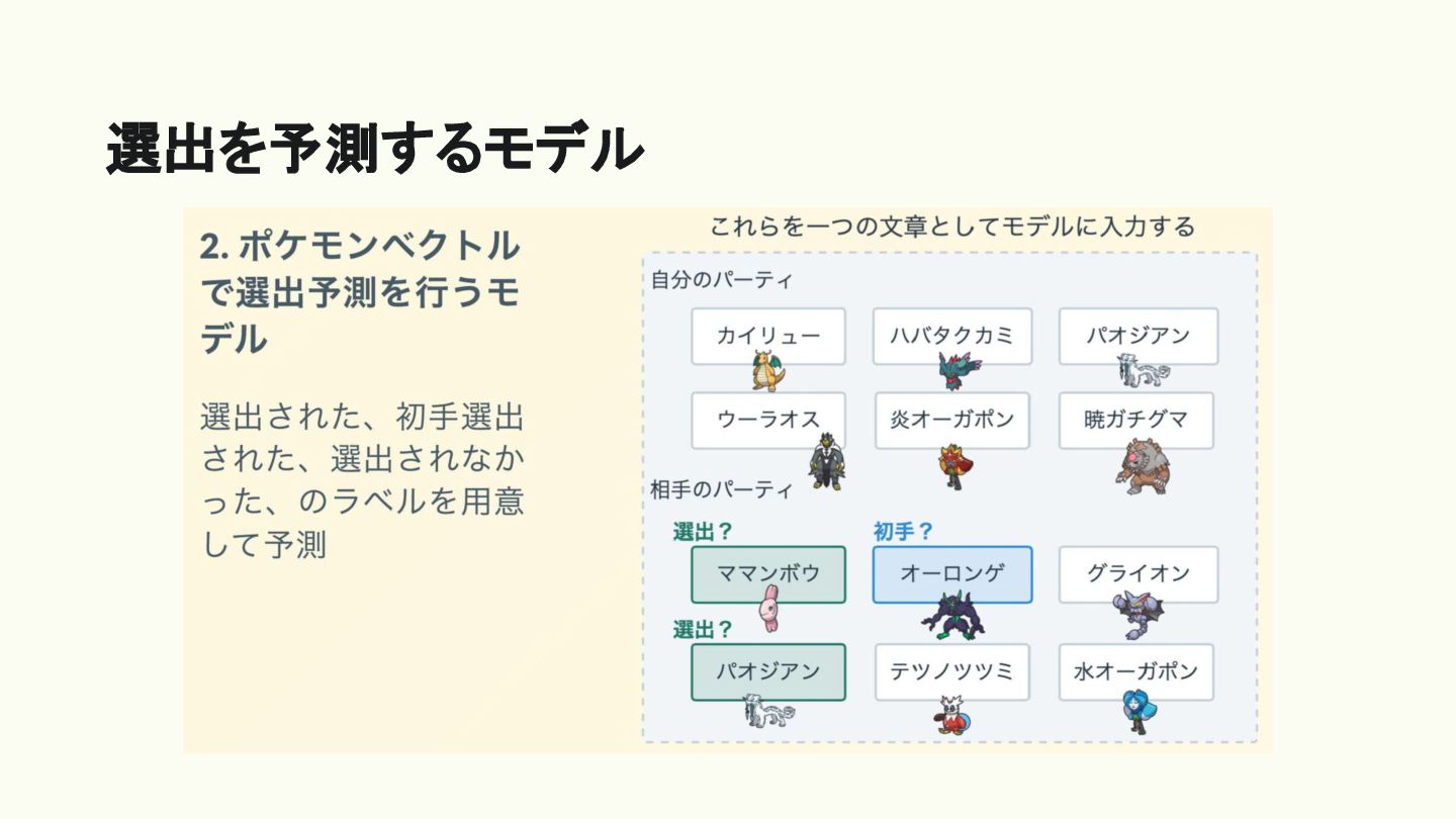 • Selection BERT(選出予測) ◦ 前述の選出提案モデル ◦ Self-Play の結果から「勝った試合での選出」を学習することで、より 強い選出ができるようになる(はず) 学習させるネットワーク