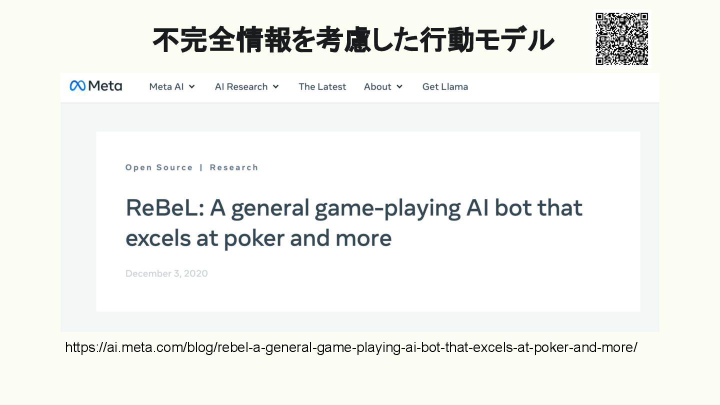 不完全情報を考慮した行動モデル https://ai.meta.com/blog/rebel-a-general-game-playing-ai-bot-that-excels-at-poker-and-more/
