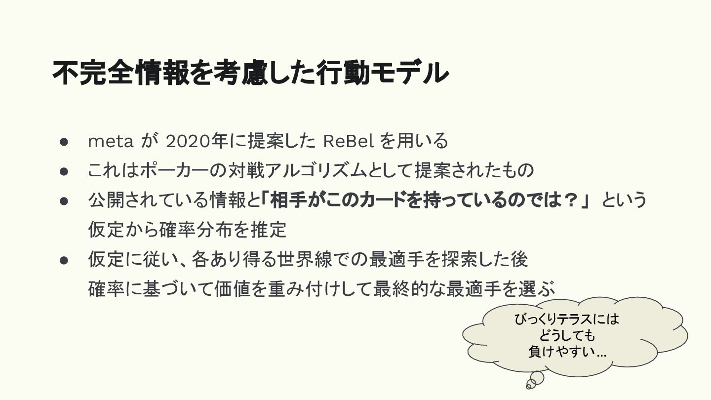 不完全情報を考慮した行動モデル • meta が 2020年に提案した ReBel を用いる • これはポーカーの対戦アルゴリズムとして提案されたもの •