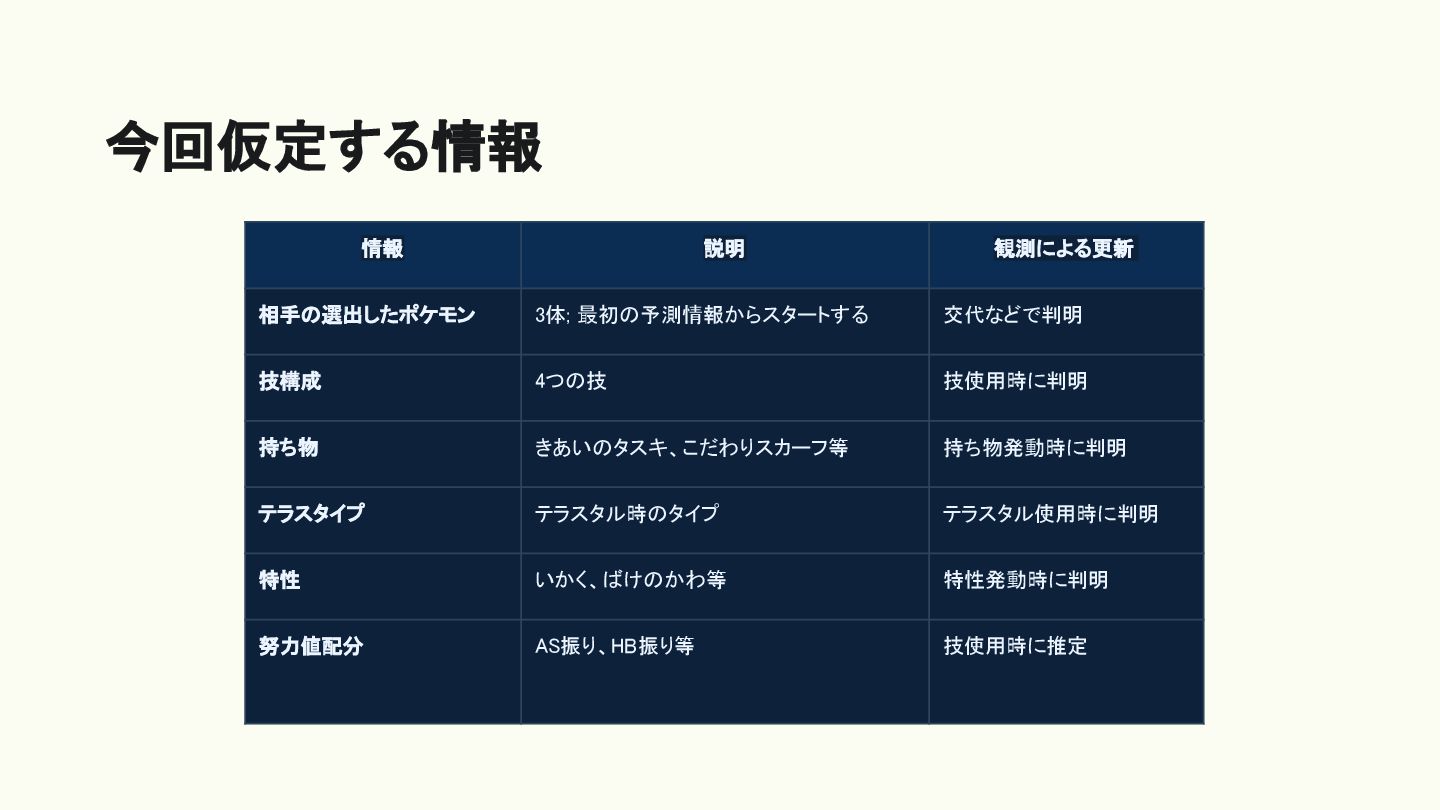今回仮定する情報 情報 説明 観測による更新 相手の選出したポケモン 3体; 最初の予測情報からスタートする 交代などで判明
