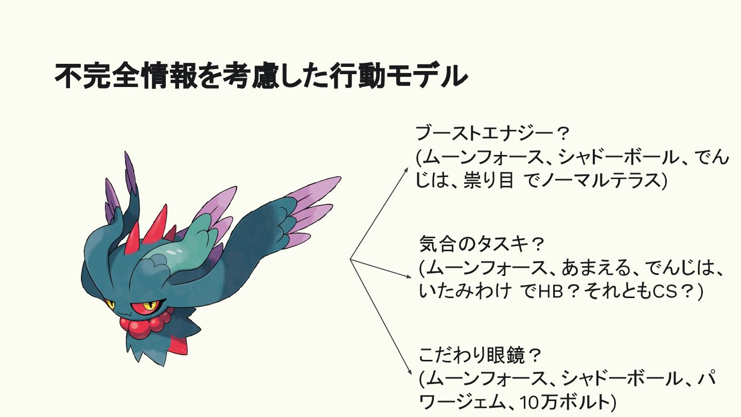 不完全情報を考慮した行動モデル ブーストエナジー? (ムーンフォース、シャドーボール、でん じは、祟り目 でノーマルテラス) 気合のタスキ? (ムーンフォース、あまえる、でんじは、 いたみわけ でHB?それともCS?) こだわり眼鏡?