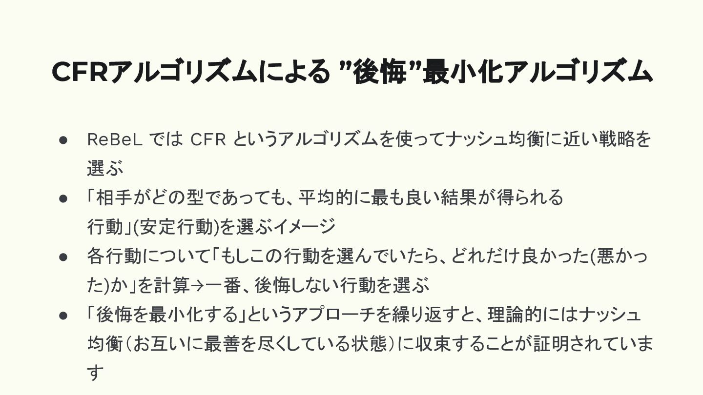CFRアルゴリズムによる ”後悔”最小化アルゴリズム • ReBeL では CFR というアルゴリズムを使ってナッシュ均衡に近い戦略を 選ぶ • 「相手がどの型であっても、平均的に最も良い結果が得られる