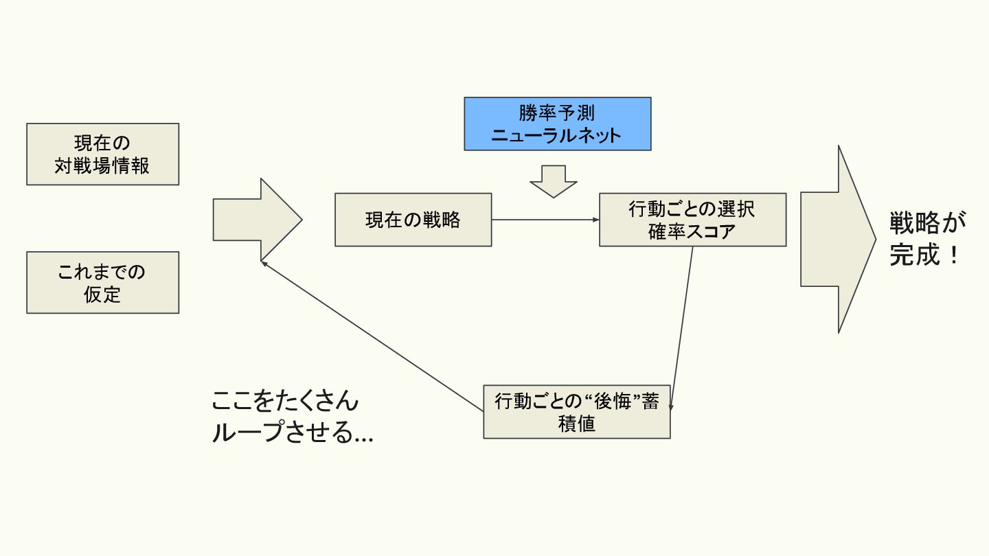 現在の 対戦場情報 これまでの 仮定 勝率予測 ニューラルネット 行動ごとの“後悔”蓄 積値 行動ごとの選択 確率スコア
