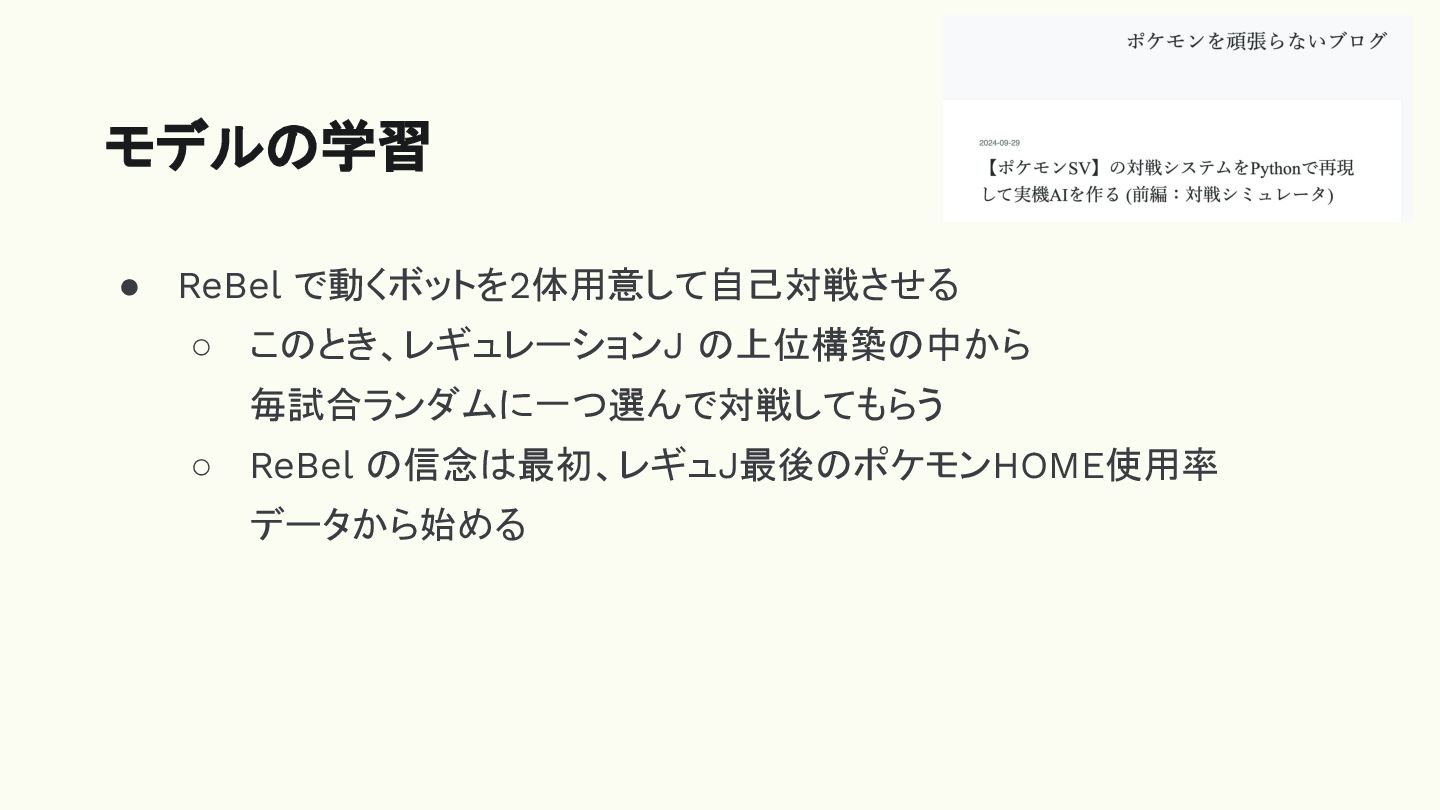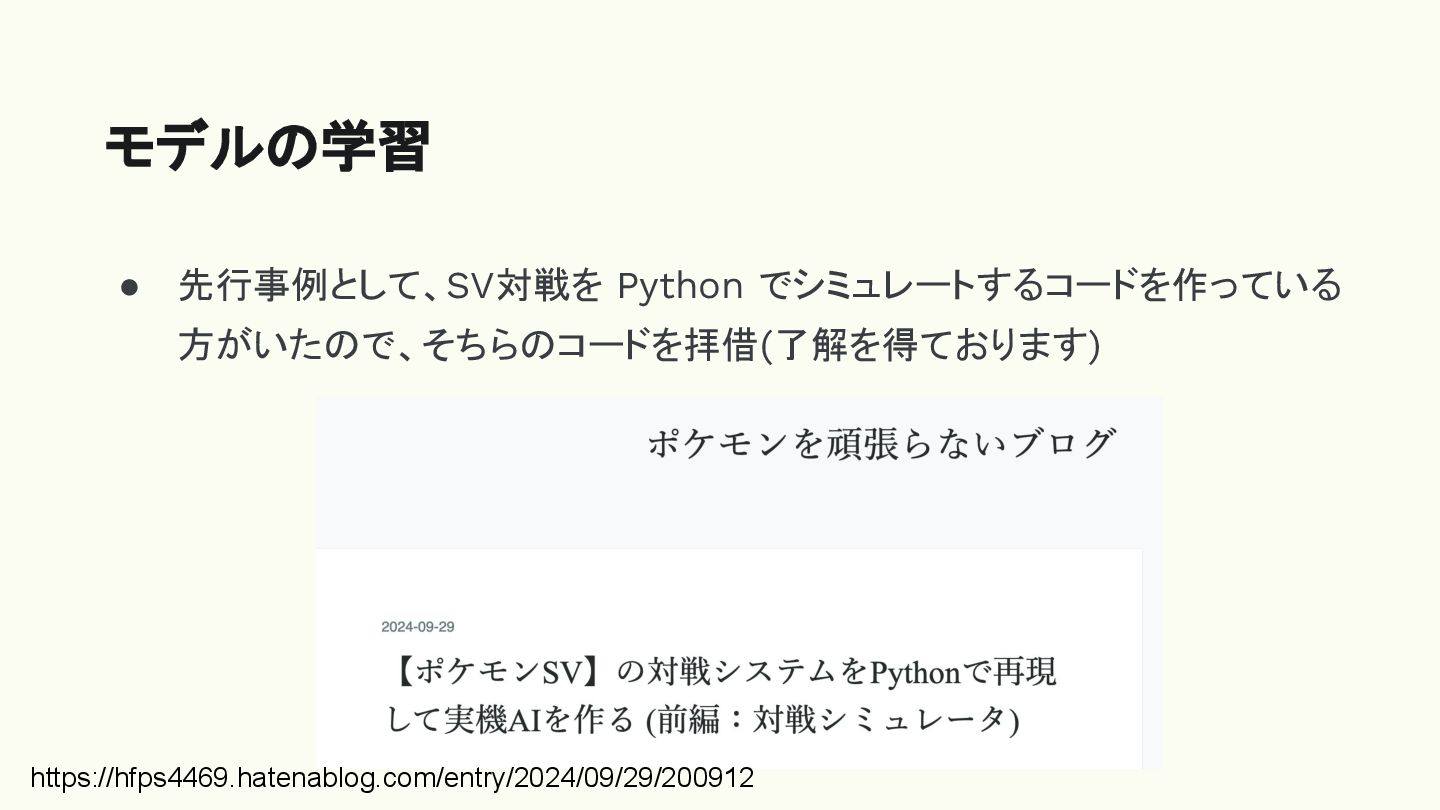 モデルの学習 • 先行事例として、SV対戦を Python でシミュレートするコードを作っている 方がいたので、そちらのコードを拝借(了解を得ております) https://hfps4469.hatenablog.com/entry/2024/09/29/200912