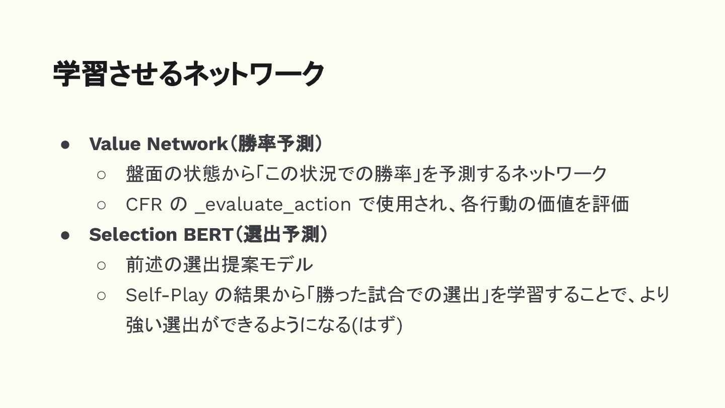 • Value Network(勝率予測) ◦ 盤面の状態から「この状況での勝率」を予測するネットワーク ◦ CFR の _evaluate_action で使用され、各行動の価値を評価