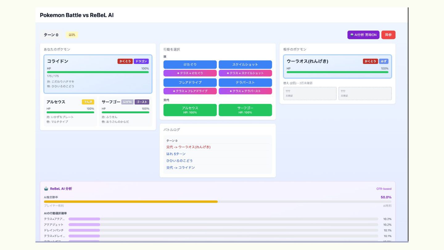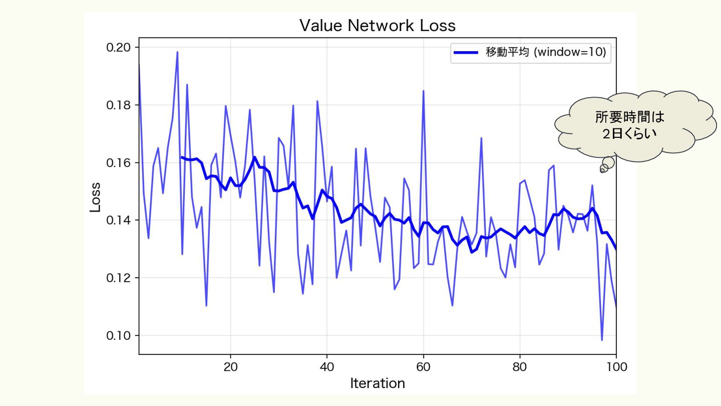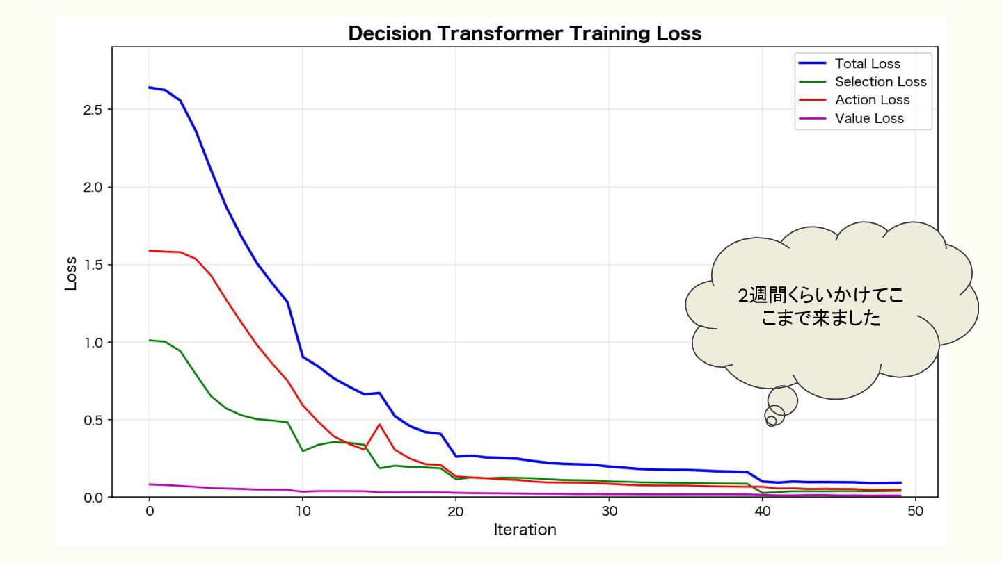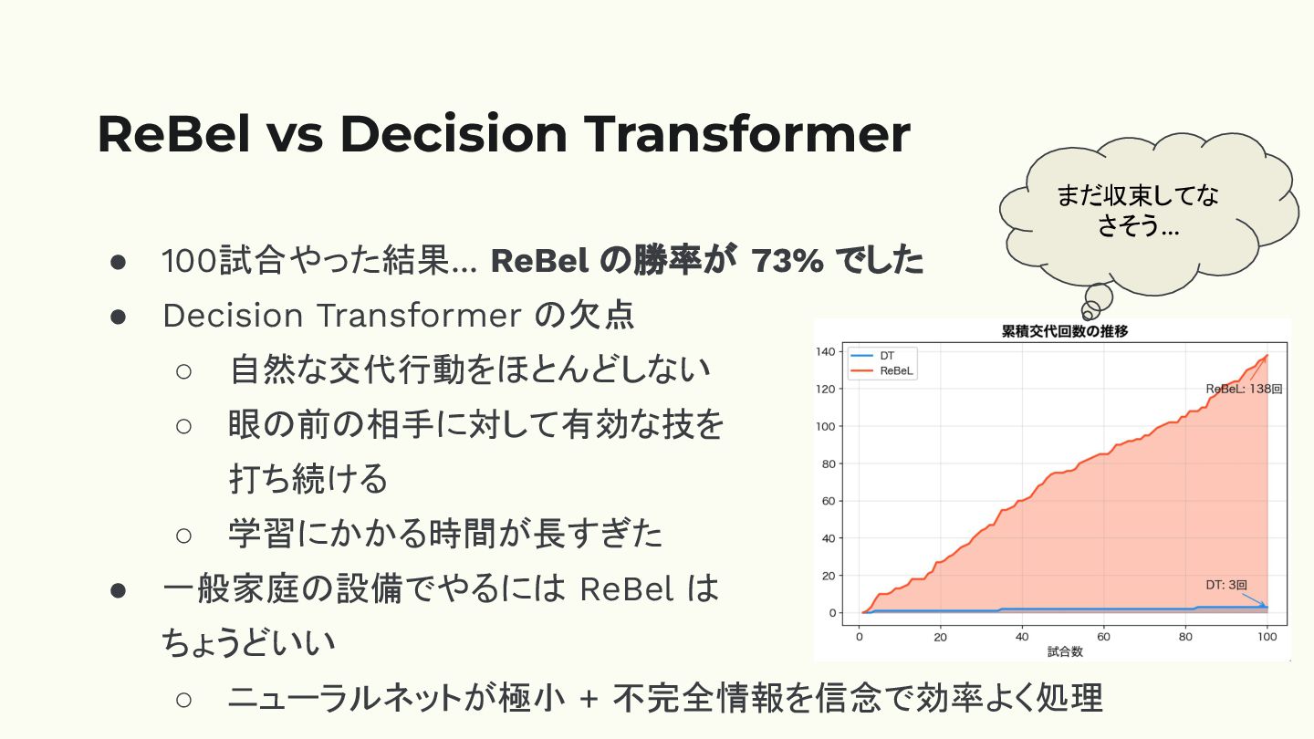 • Decision Transformer の欠点 ◦ 自然な交代行動をほとんどしない ◦ 眼の前の相手に対して有効な技を 打ち続ける ◦ 学習にかかる時間が長すぎた • 一般家庭の設備でやるには ReBel は ちょうどいい ◦ ニューラルネットが極小 + 不完全情報を信念で効率よく処理 まだ収束してな さそう...