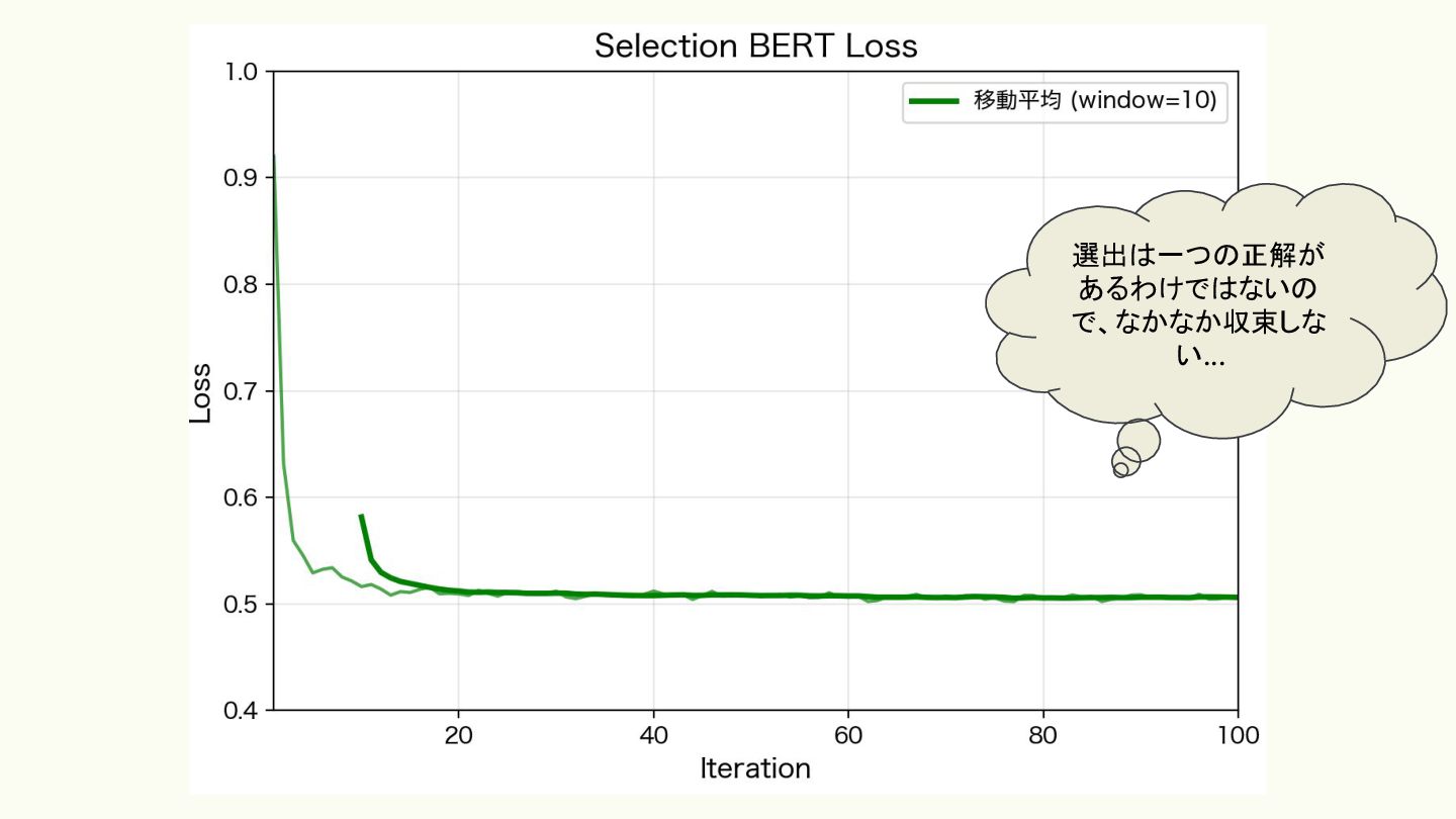選出は一つの正解が あるわけではないの で、なかなか収束しな い...