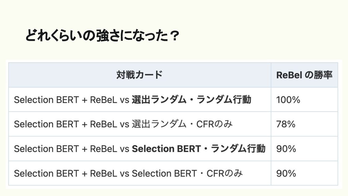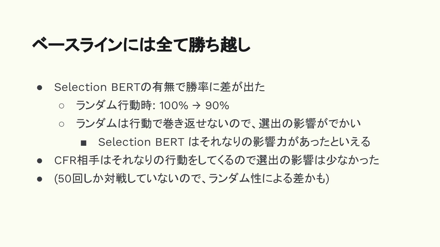 ベースラインには全て勝ち越し • Selection BERTの有無で勝率に差が出た ◦ ランダム行動時: 100% → 90% ◦