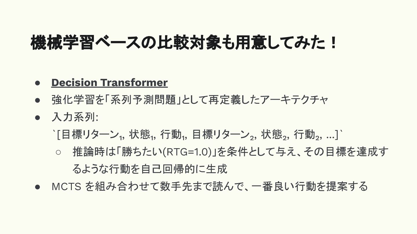 行動₁, 目標リターン₂, 状態₂, 行動₂, ...]` ◦ 推論時は「勝ちたい(RTG=1.0)」を条件として与え、その目標を達成す るような行動を自己回帰的に生成 • MCTS を組み合わせて数手先まで読んで、一番良い行動を提案する
