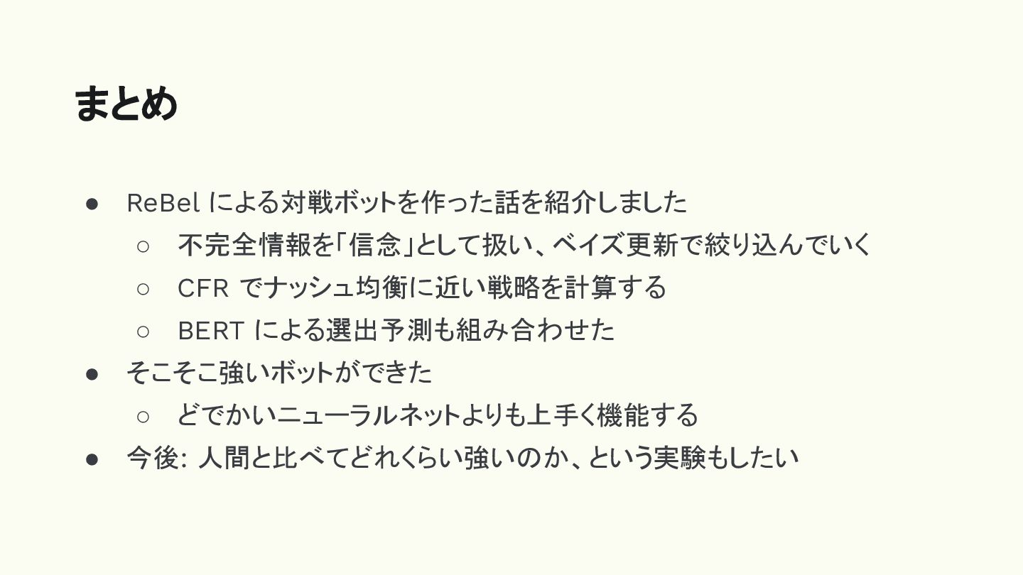 • ReBel による対戦ボットを作った話を紹介しました ◦ 不完全情報を「信念」として扱い、ベイズ更新で絞り込んでいく ◦ CFR でナッシュ均衡に近い戦略を計算する ◦ BERT