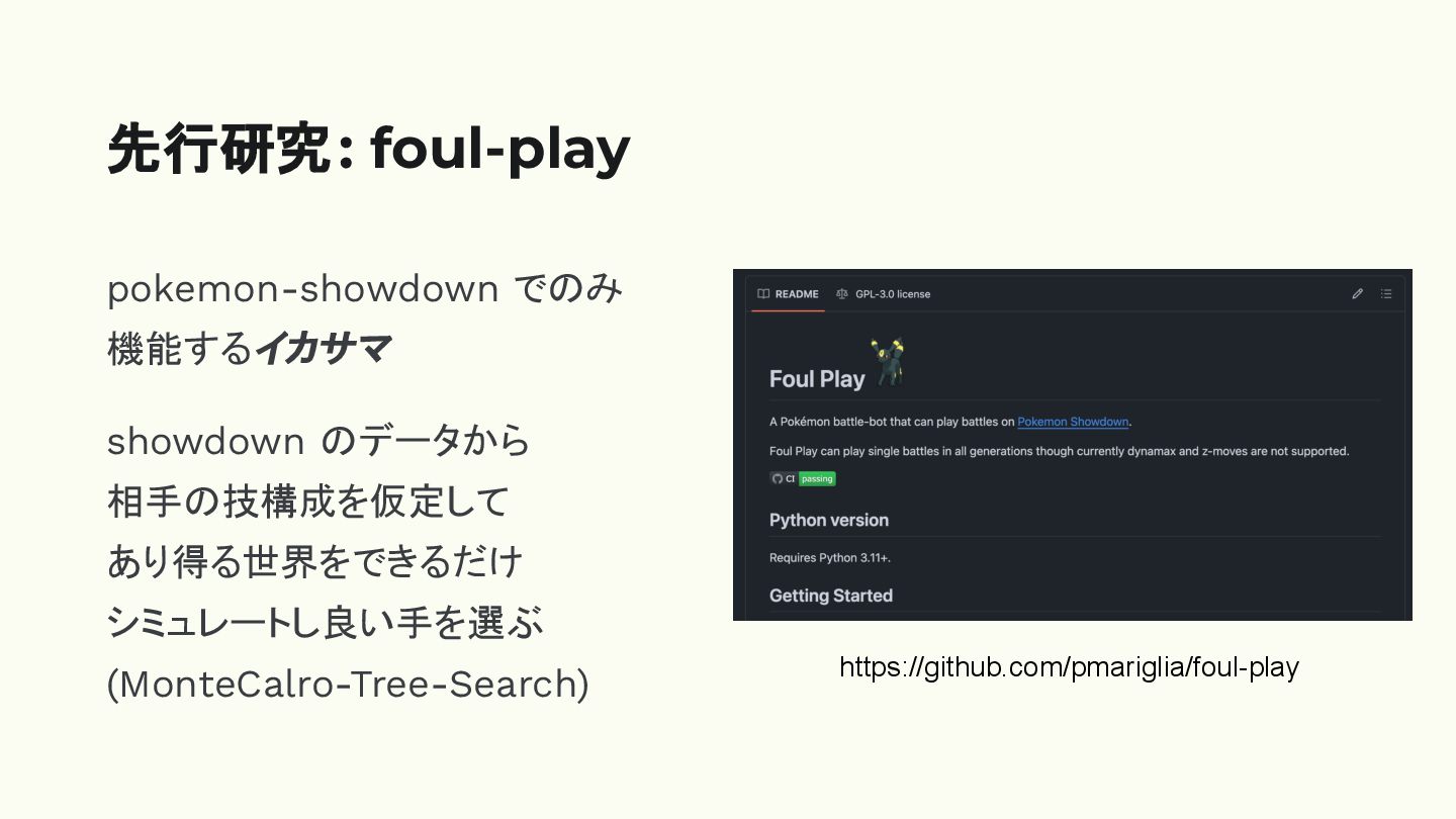 先行研究: foul-play pokemon-showdown でのみ 機能するイカサマ showdown のデータから 相手の技構成を仮定して あり得る世界をできるだけ シミュレートし良い手を選ぶ