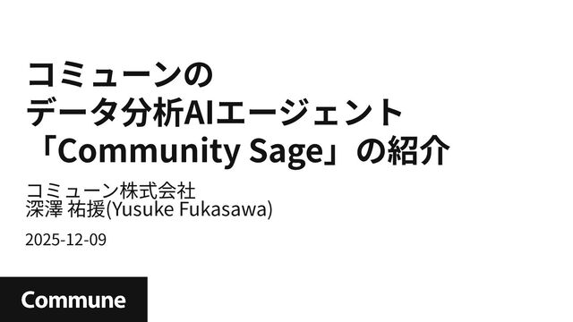 コミューン株式会社ではコミュニティ支援を行う上で必要なデータ分析業務を手伝ってくれるデータ分析エージェント「community sage」が存在します。 こちらのスライドではモチベーション、経緯を話しつつ、どのような機能を持っているのかを紹介します。