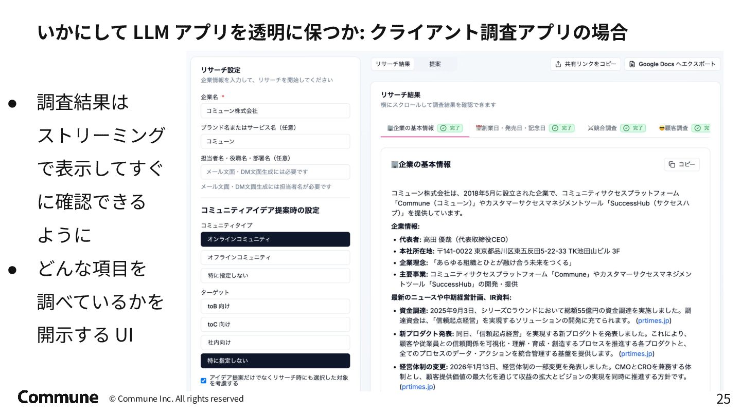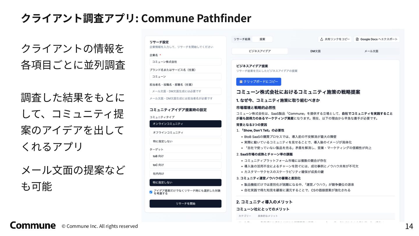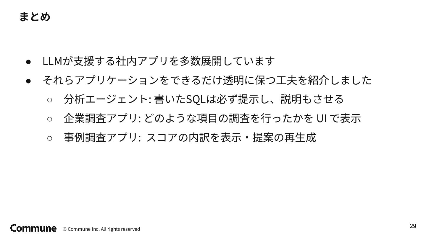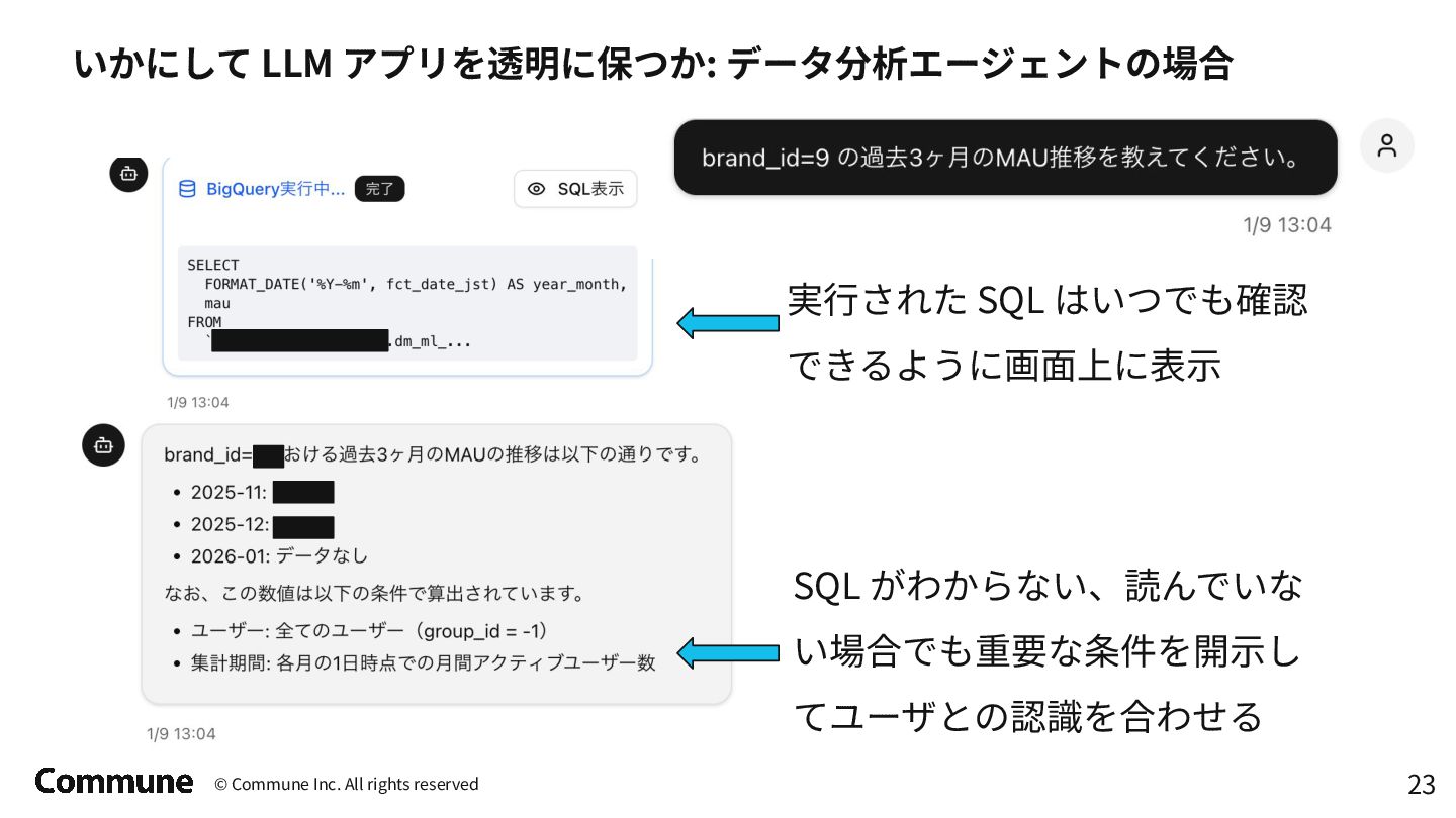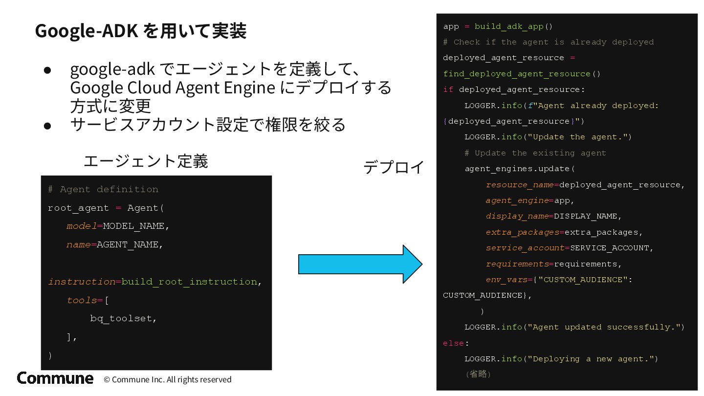 google-adk でエージェントを定義して、 Google Cloud Agent Engine にデプロイする ⽅式に変更 • サービスアカウント設定で権限を絞る エージェント定義 # Agent definition root_agent = Agent( model=MODEL_NAME, name=AGENT_NAME, instruction=build_root_instruction, tools=[ bq_toolset, ], ) app = build_adk_app() # Check if the agent is already deployed deployed_agent_resource = find_deployed_agent_resource() if deployed_agent_resource: LOGGER.info(f"Agent already deployed: {deployed_agent_resource}") LOGGER.info("Update the agent.") # Update the existing agent agent_engines.update( resource_name=deployed_agent_resource, agent_engine=app, display_name=DISPLAY_NAME, extra_packages=extra_packages, service_account=SERVICE_ACCOUNT, requirements=requirements, env_vars={"CUSTOM_AUDIENCE": CUSTOM_AUDIENCE}, ) LOGGER.info("Agent updated successfully.") else: LOGGER.info("Deploying a new agent.") (省略) デプロイ