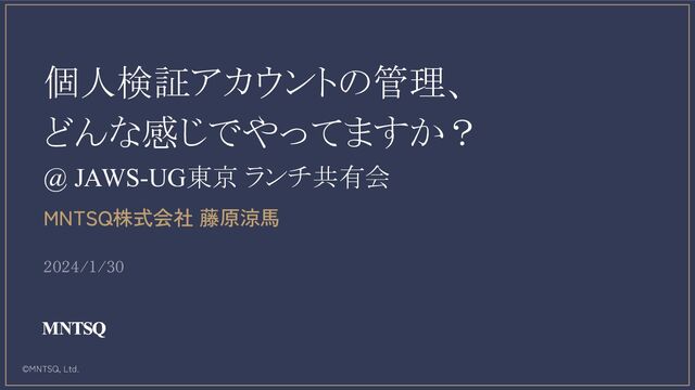 ©MNTSQ, Ltd. 2024/1/30 個人検証アカウントの管理、 どんな感じでやってますか? @ JAWS-UG東京 ランチ共有会 MNTSQ株式会社 藤原涼馬