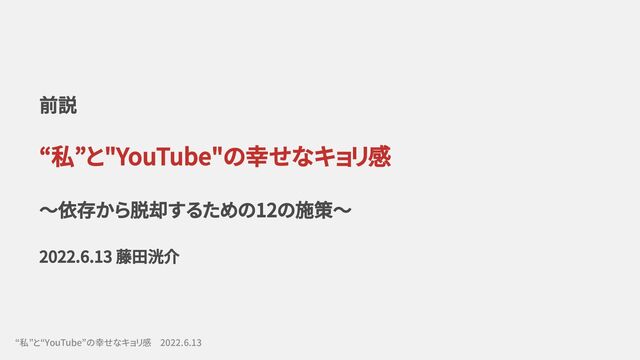 前説 “私”と"YouTube"の幸せなキョリ感 ~依存から脱却するための12の施策~ 2022.6.13 藤田洸介 “私”と“YouTube”の幸せなキョリ感 2022.6.13