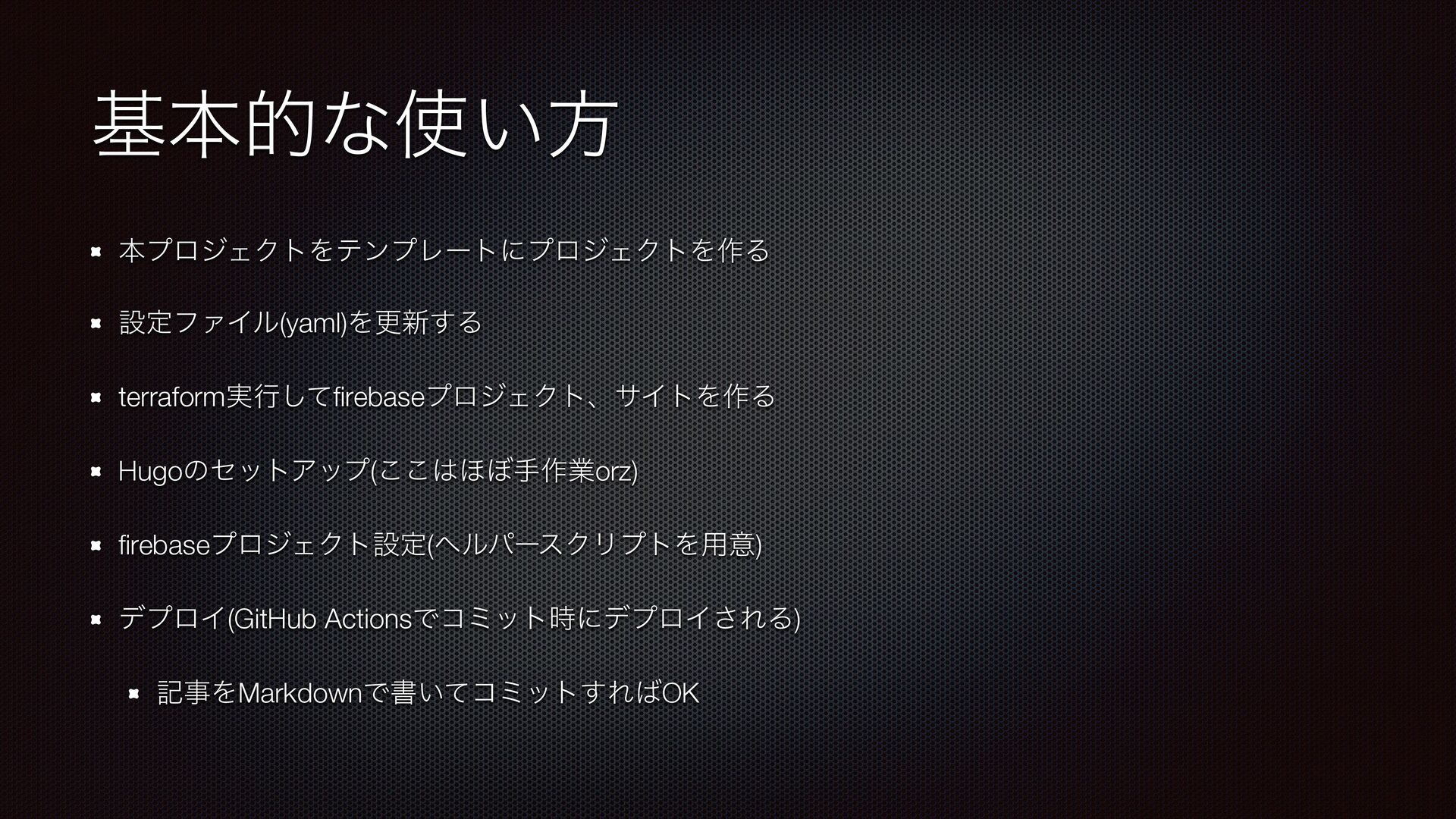 جຊతͳ͍ํ ຊϓϩδΣΫτΛςϯϓϨʔτʹϓϩδΣΫτΛ࡞Δ ઃఆϑΝΠϧ(yaml)Λߋ৽͢Δ terraform࣮ߦͯ͠ fi rebaseϓϩδΣΫτɺαΠτΛ࡞Δ HugoͷηοτΞοϓ(͜͜΄΅ख࡞ۀorz) fi rebaseϓϩδΣΫτઃఆ(ϔϧύʔεΫϦϓτΛ༻ҙ) σϓϩΠ(GitHub