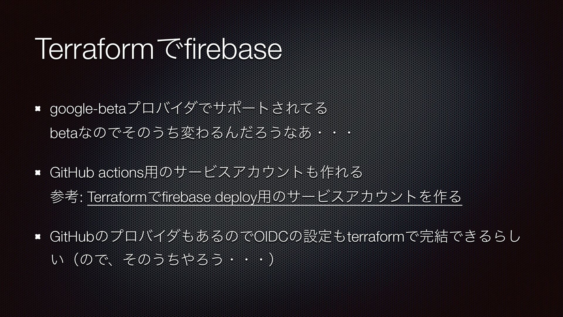 TerraformͰ fi rebase google-betaϓϩόΠμͰαϙʔτ͞ΕͯΔ betaͳͷͰͦͷ͏ͪมΘΔΜͩΖ͏ͳ͋ɾɾɾ GitHub actions༻ͷαʔϏεΞΧϯτ࡞ΕΔ ࢀߟ: TerraformͰ fi