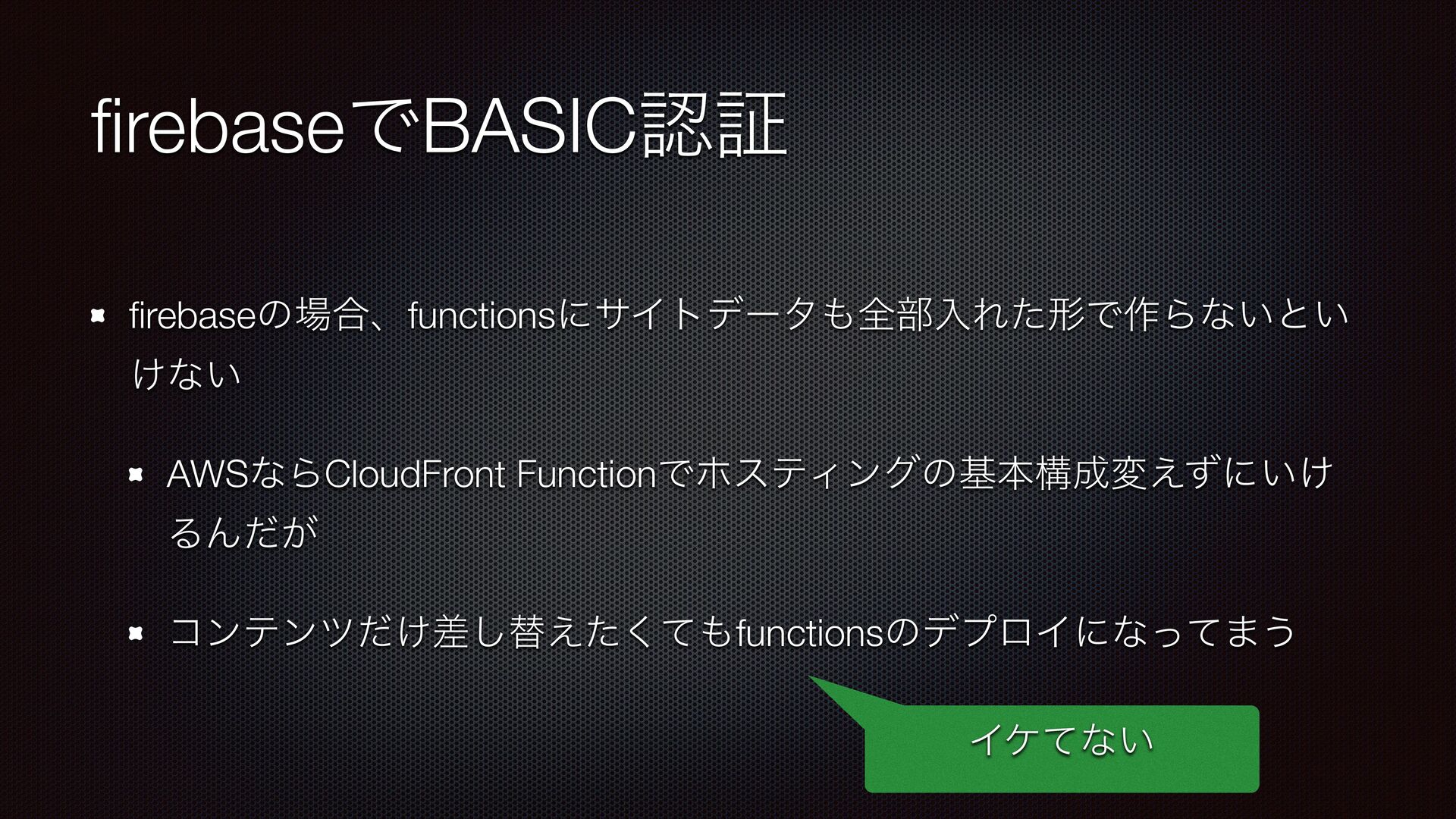fi rebaseͰBASICೝূ fi rebaseͷ߹ɺfunctionsʹαΠτσʔλશ෦ೖΕͨܗͰ࡞Βͳ͍ͱ͍ ͚ͳ͍ AWSͳΒCloudFront FunctionͰϗεςΟϯάͷجຊߏม͑ͣʹ͍͚ ΔΜ͕ͩ ίϯςϯπ͚ͩࠩ͠ସ͑ͨͯ͘functionsͷσϓϩΠʹͳͬͯ·͏ Πέͯͳ͍
