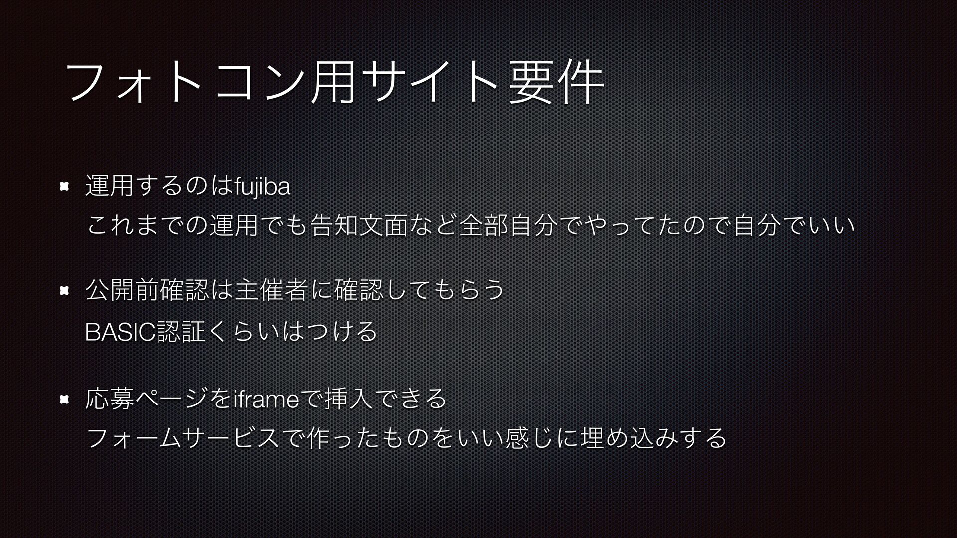 ϑΥτίϯ༻αΠτཁ݅ ӡ༻͢Δͷfujiba ͜Ε·Ͱͷӡ༻Ͱࠂจ໘ͳͲશ෦ࣗͰͬͯͨͷͰࣗͰ͍͍ ެ։લ֬ೝओ࠵ऀʹ֬ೝͯ͠Β͏ BASICೝূ͘Β͍͚ͭΔ ԠืϖʔδΛiframeͰૠೖͰ͖Δ ϑΥʔϜαʔϏεͰ࡞ͬͨͷΛ͍͍ײ͡ʹຒΊࠐΈ͢Δ