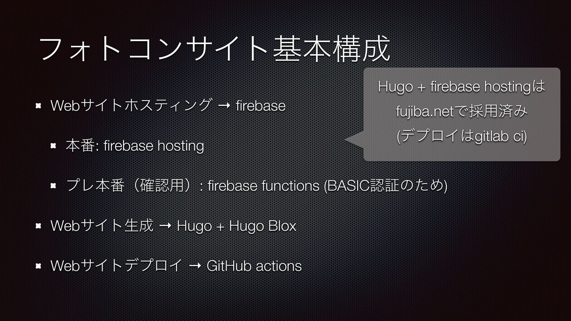 fi rebase functions (BASICೝূͷͨΊ) WebαΠτੜ → Hugo + Hugo Blox WebαΠτσϓϩΠ → GitHub actions Hugo + fi rebase hosting fujiba.netͰ࠾༻ࡁΈ (σϓϩΠgitlab ci)