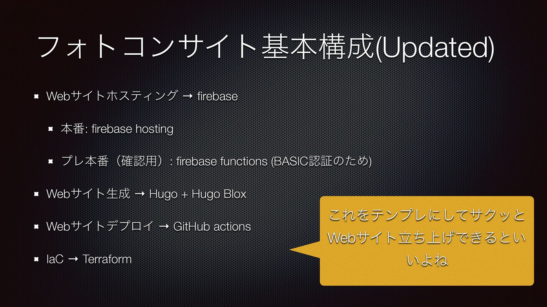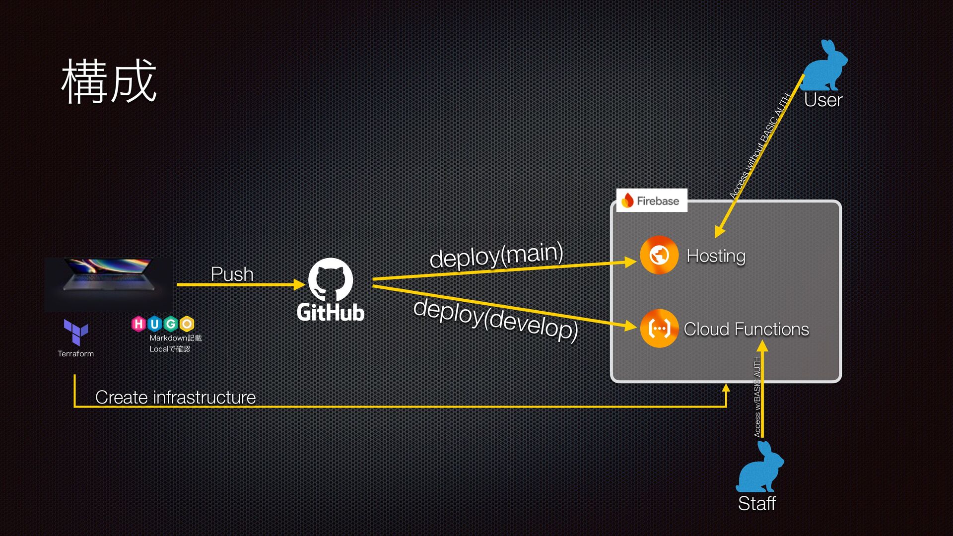 fi rebase functions (BASICೝূͷͨΊ) WebαΠτੜ → Hugo + Hugo Blox WebαΠτσϓϩΠ → GitHub actions IaC → Terraform ͜ΕΛςϯϓϨʹͯ͠αΫοͱ WebαΠτ্ཱͪ͛Ͱ͖Δͱ͍ ͍ΑͶ