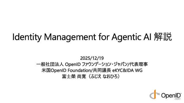 1714348800, "auth_time": 1714348800, "nonce": "n-0S6_WzA2Mj", "agent_type": "assistant", "agent_model": "gpt-4", "agent_version": "2025-03", "agent_provider": "openai.com", "agent_instance_id": "agent_instance_789", "delegator_sub": "user_456", "delegation_purpose": "Email management assistant", エージェント情報を含むIDトークンの例 12 Copyright © 2025, Naohiro Fujie, All Rights Reserved "agent_capabilities": ["email:read", "email:draft", "calendar:view"], "agent_trust_level": "verified", "agent_context_id": "conversation_123", "agent_attestation": { "format": "urn:ietf:params:oauth:token-type:eat", "token": "eyJhbGciOiJSUzI1NiIsInR5cCI6IkpXVCJ9...", "timestamp": 1714348800 }, "delegation_chain": [ { "iss": "https://auth.example.com", "sub": "user_456", "aud": "agent_instance_789", "delegated_at": 1714348700, "scope": "email profile calendar" }