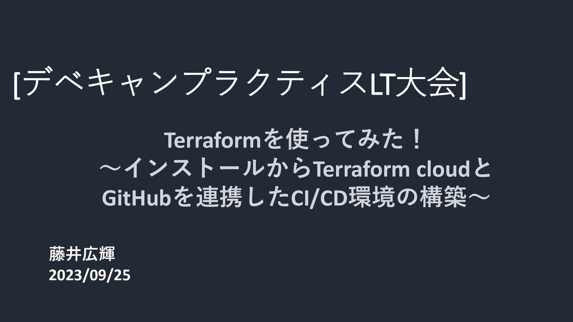 [デベキャンプラクティスLT大会] Terraformを使ってみた! ~インストールからTerraform cloudと GitHubを連携したCI/CD環境の構築~ 藤井広輝 2023/09/25