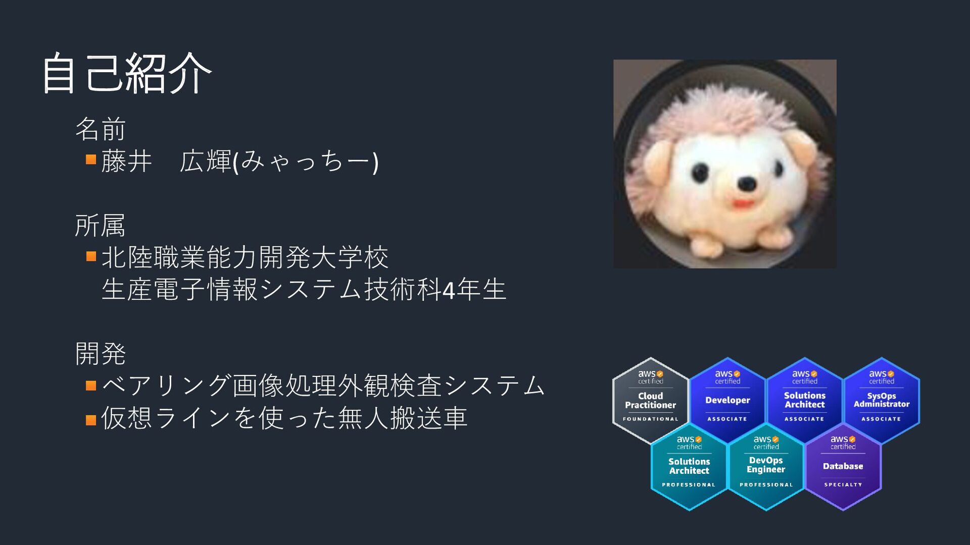 自己紹介 名前 藤井 広輝(みゃっちー) 所属 北陸職業能力開発大学校 生産電子情報システム技術科4年生 開発 ベアリング画像処理外観検査システム 仮想ラインを使った無人搬送車