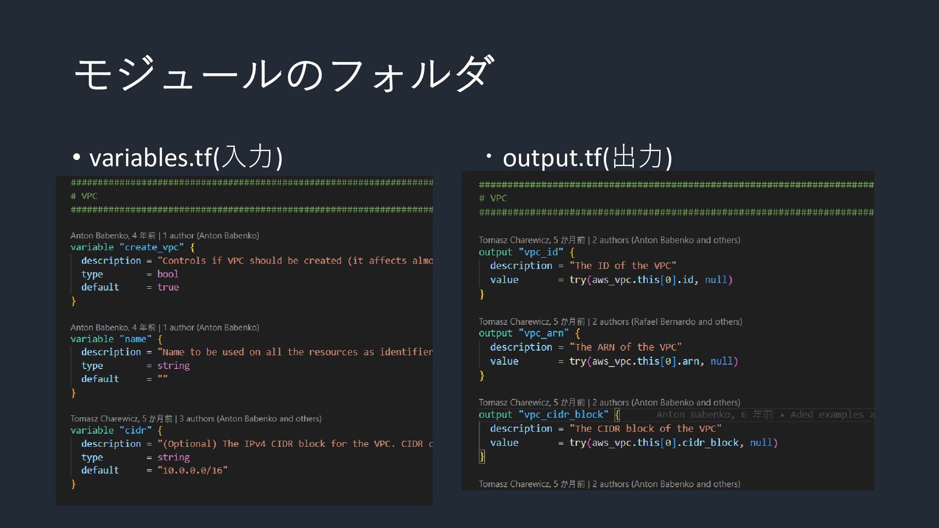 モジュールのフォルダ • variables.tf(入力) ・output.tf(出力)