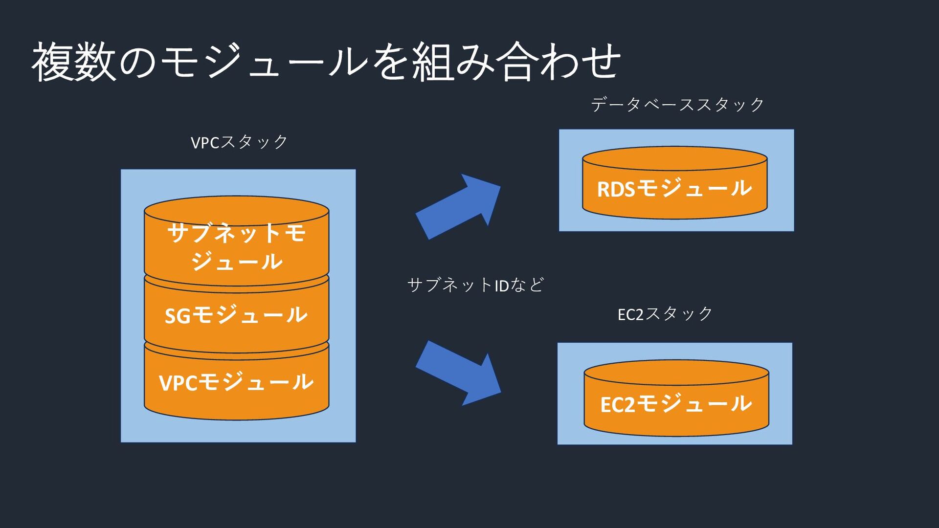 VPCモジュール 複数のモジュールを組み合わせ RDSモジュール EC2モジュール サブネットIDなど SGモジュール サブネットモ ジュール VPCスタック データベーススタック