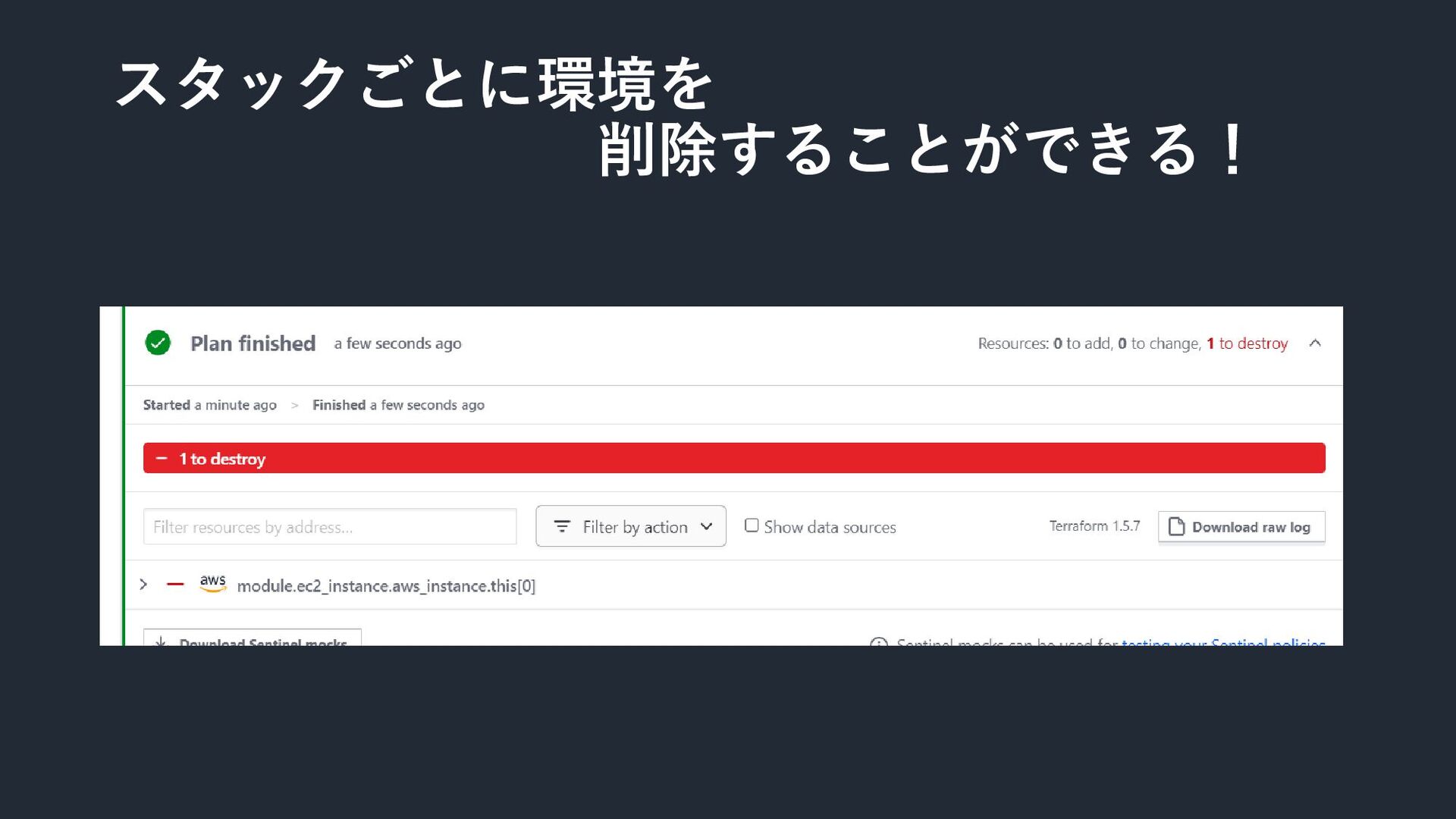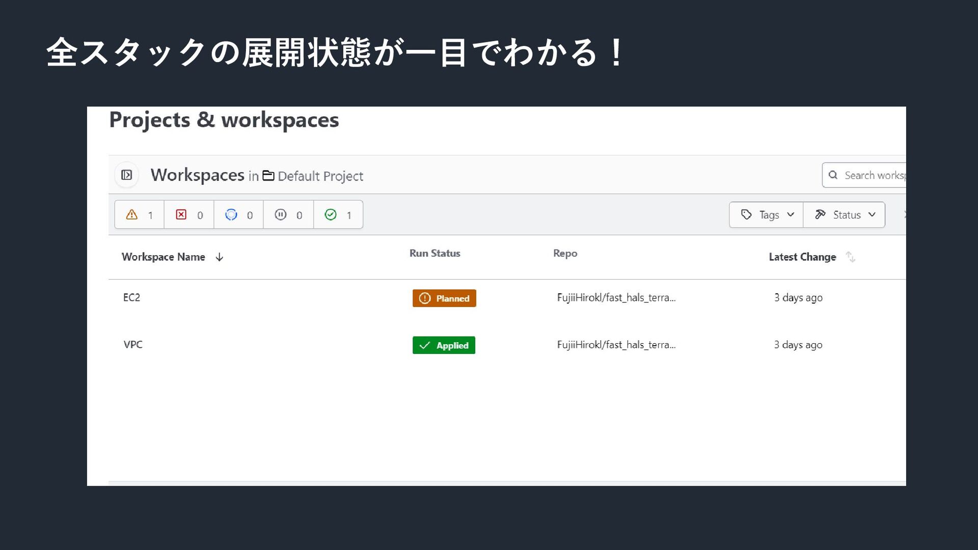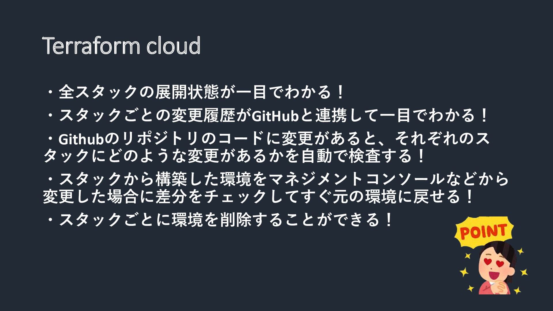 ・全スタックの展開状態が一目でわかる! ・スタックごとの変更履歴がGitHubと連携して一目でわかる! ・Githubのリポジトリのコードに変更があると、それぞれのス タックにどのような変更があるかを自動で検査する! ・スタックから構築した環境をマネジメントコンソールなどから 変更した場合に差分をチェックしてすぐ元の環境に戻せる! ・スタックごとに環境を削除することができる! Terraform cloud