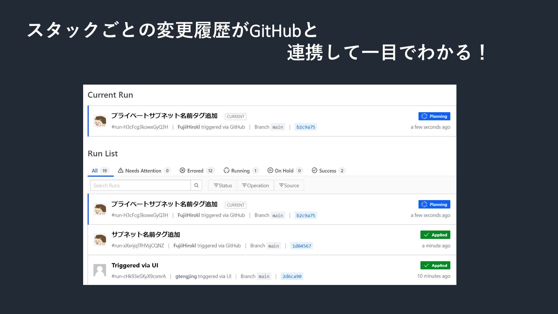 スタックごとの変更履歴がGitHubと 連携して一目でわかる!