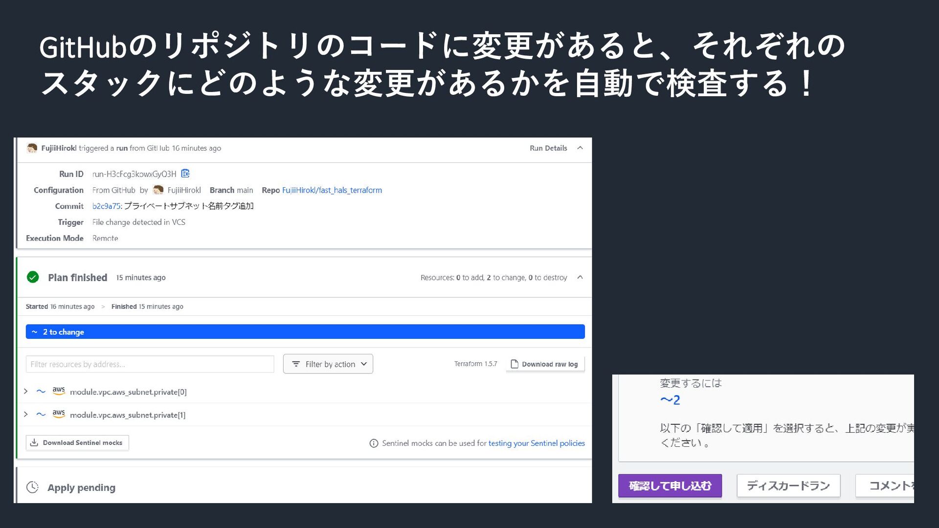 GitHubのリポジトリのコードに変更があると、それぞれの スタックにどのような変更があるかを自動で検査する!