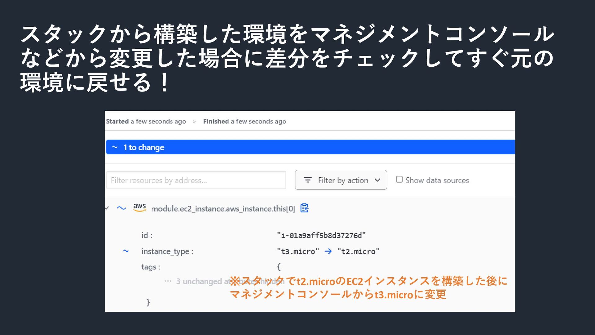 スタックから構築した環境をマネジメントコンソール などから変更した場合に差分をチェックしてすぐ元の 環境に戻せる! ※スタックでt2.microのEC2インスタンスを構築した後に マネジメントコンソールからt3.microに変更